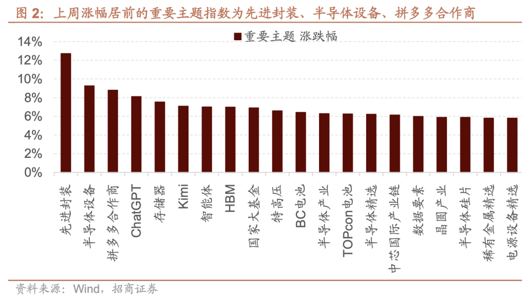 上周,A股涨幅居前的重要主题指数为先进封装、半导体设备、拼多多合作商。