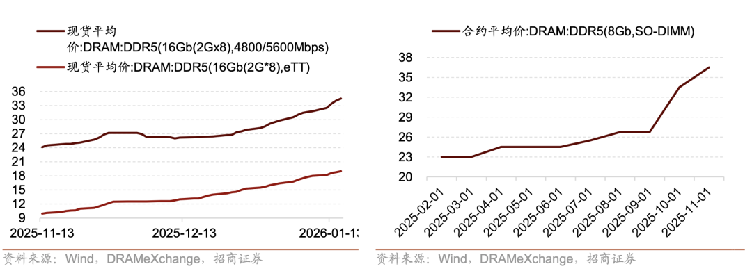 在DRAM上,从2025年11月中旬到2026年1月中旬,DDR5 16Gb(2G×8)DRAM 现货价格呈现出持续、加速上行的走势。其中,DDR5 4800/5600Mbps 规格的现货均价由 2025-11-13 的 24.13 美元一路上涨至 2026-01-15 的 34.50 美元,阶段累计涨幅约 43%;eTT 规格价格同期从 9.95 美元升至 19.00 美元,累计涨幅接近 91%,涨幅明显高于前者。价格节奏上看,11 月中下旬至 12 月上旬以缓慢抬升为主,12 月中旬后涨速明显加快,进入 2026 年初后出现连续跳涨,反映出 DDR5 主流 16Gb 颗粒在现货市场的供需紧张程度持续加深,现货端对需求变化的敏感性显著增强。