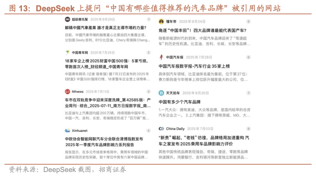 比如在主流中文大模型中询问“中国有哪些值得推荐的汽车品牌”时,可以观察到其答案往往同时引用权威新闻媒体与汽车领域垂直媒体的信息。这类来源一方面提供品牌的可信背书,另一方面补充了车型评测、市场表现和用户口碑等细分语义。对于领域垂直媒体而言,关键不在于内容数量,而在于信息是否具备清晰的结构、稳定的事实表述和可被模型理解与引用的知识形态。对汽车厂商来说,除了提升官媒与权威媒体的曝光度,还需要系统性地进入垂直媒体、评测平台与行业数据库,使品牌相关信息在不同知识源中形成一致、可验证的表达。