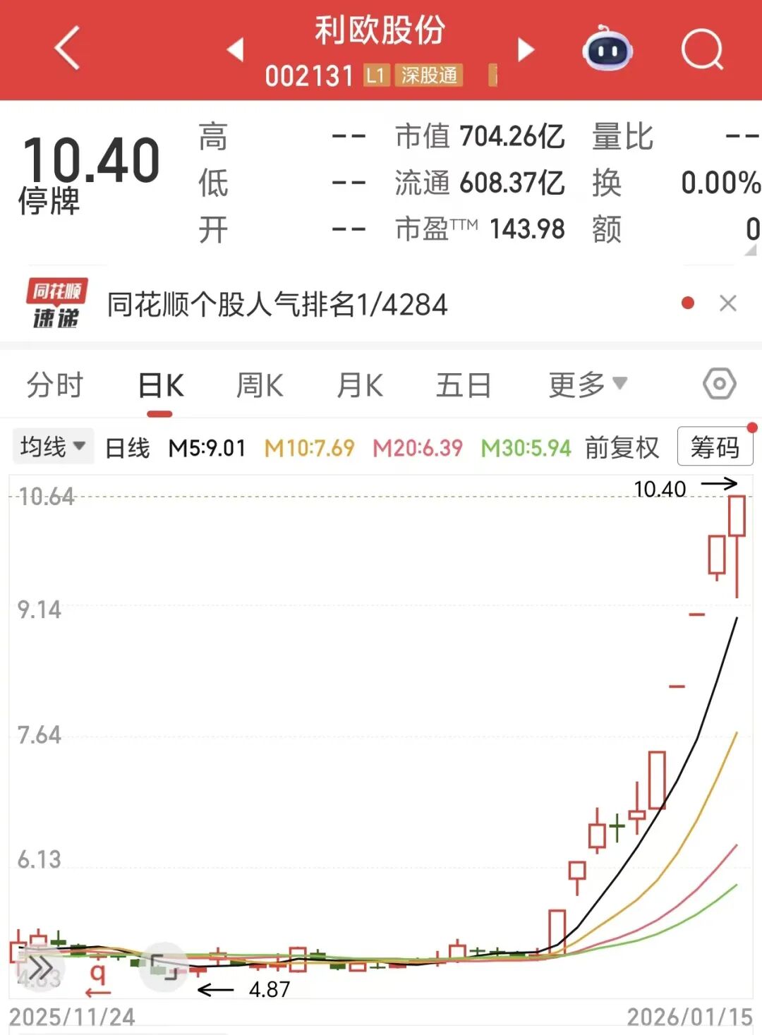 同花顺数据显示,停牌前最后一个交易日(1月15日),利欧股份收报10.4元/股,总市值为704.26亿元。2025年12月31日-2026年1月15日这10个交易日内,公司股价累计涨幅为102.73%。