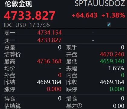 1月20日,国际金价走势强劲,历史首次突破4700美元/盎司整数关口。截至记者发稿,伦敦金现日内大涨1.38%,现报4733.827美元/盎司,盘中最高触及4736.368美元/盎司,刷新历史纪录。