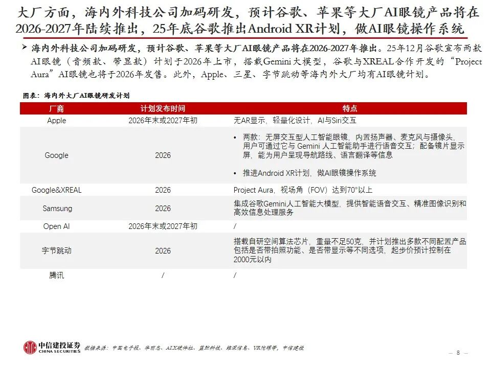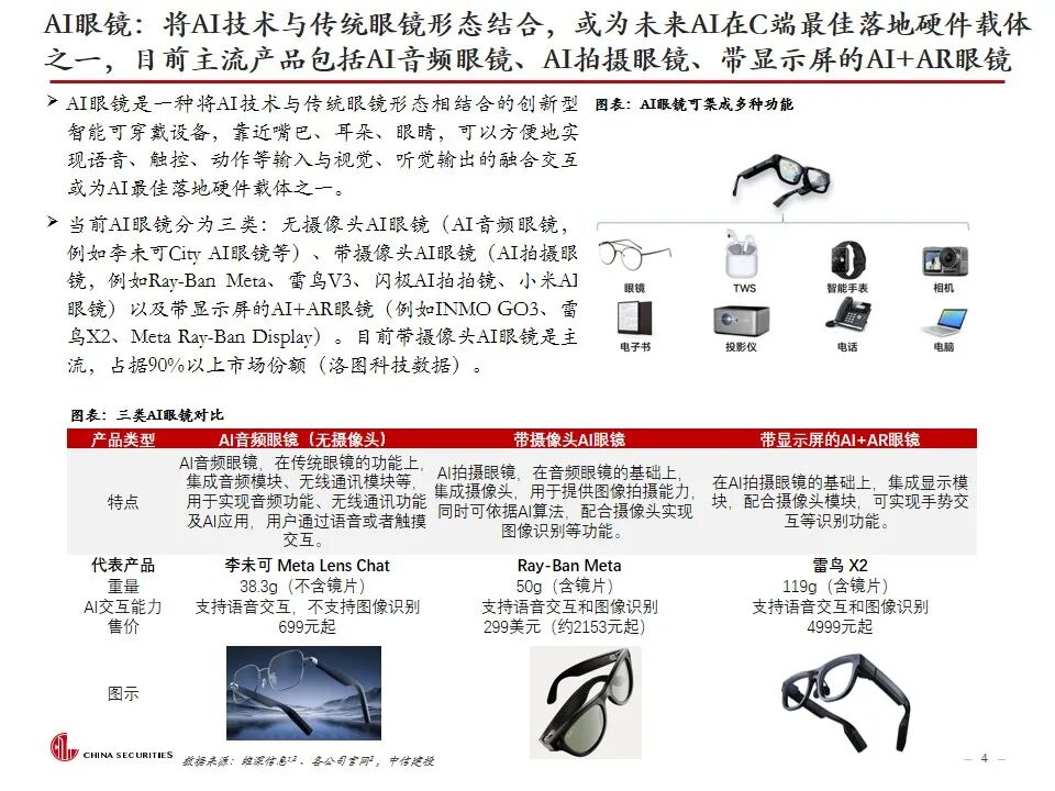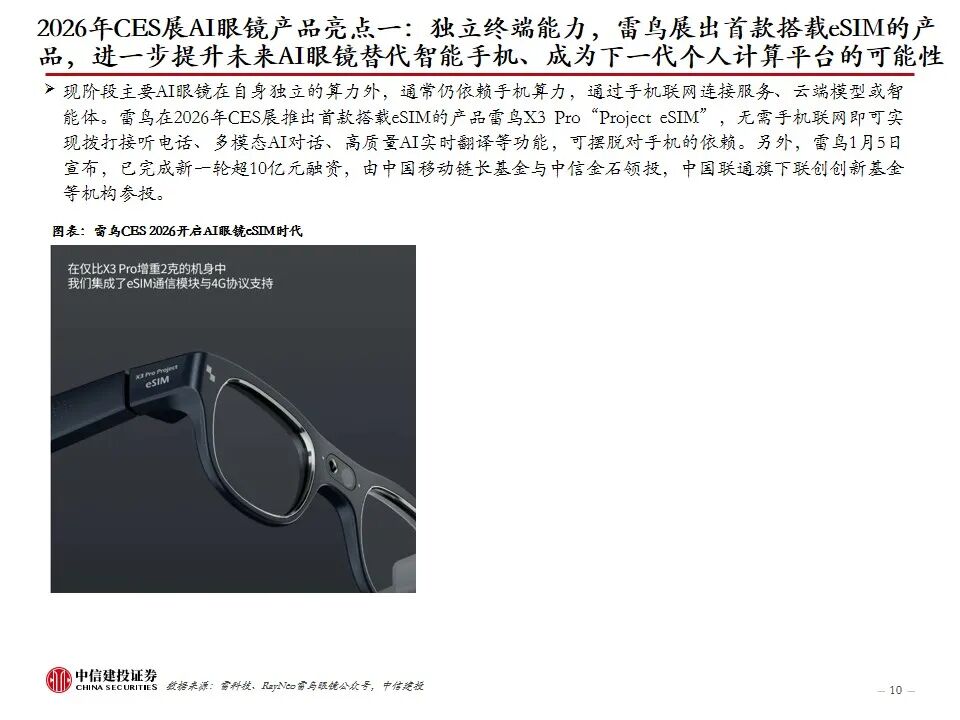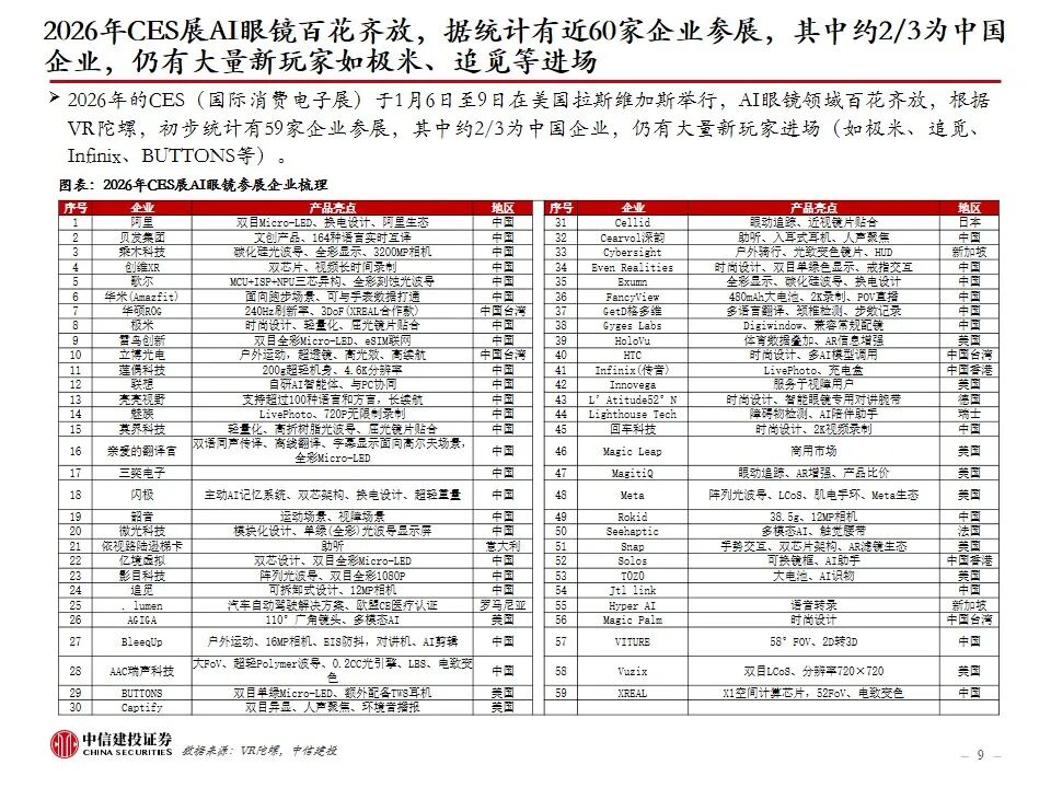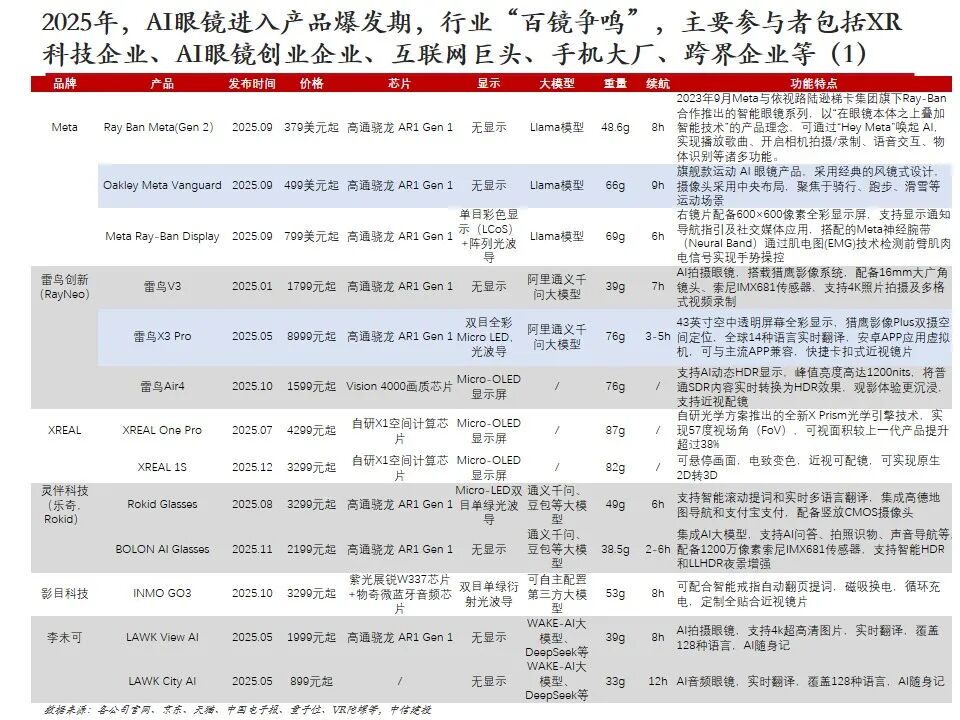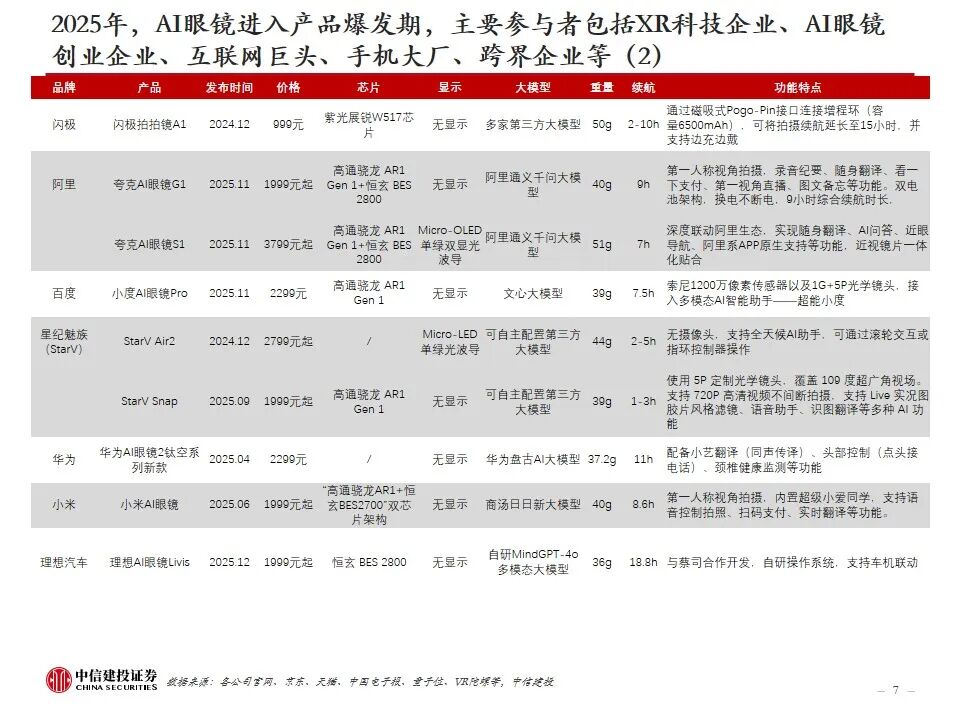 复盘AI眼镜行业发展及近况:AI眼镜将AI技术与传统眼镜形态结合,或为未来AI在C端最佳落地硬件载体之一,目前主流产品包括AI音频眼镜、AI拍摄眼镜、带显示屏的AI AR眼镜。2023年9月Meta开启AI眼镜时代,其发布的Ray-Ban Meta为行业首款出货量超百万台的AI眼镜。2025年AI眼镜进入产品爆发期,行业“百镜争鸣”,主要参与者包括XR科技企业、AI眼镜创业企业、互联网巨头、手机大厂、跨界企业等,海内外科技公司加码研发,预计谷歌、苹果等大厂AI眼镜产品将在2026-2027年陆续推出。2026年CES展会上,AI眼镜百花齐放,仍有大量新玩家进场,产品整体呈现出独立终端能力突破、多芯片方案、轻量化设计、垂类场景深耕、换电续航等趋势。政策层面,2026年AI眼镜纳入国补,有望带动消费需求进一步提升。