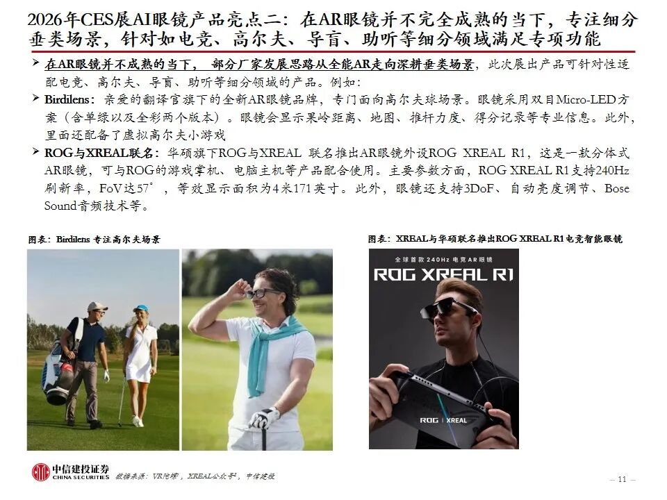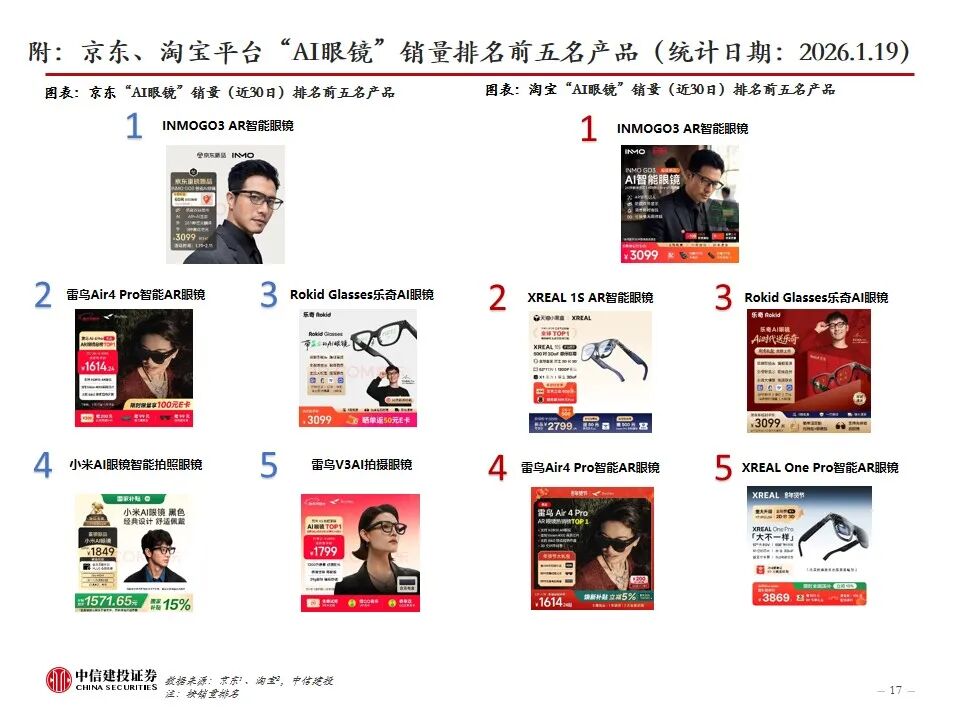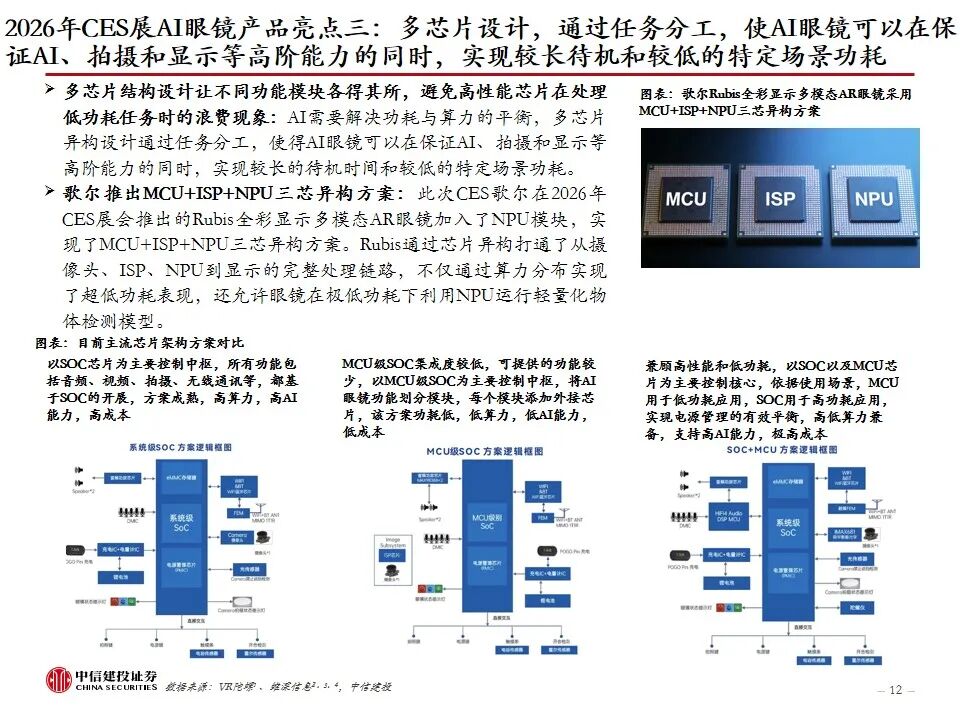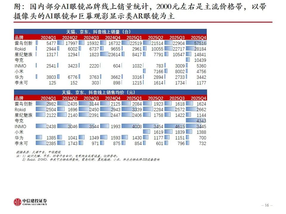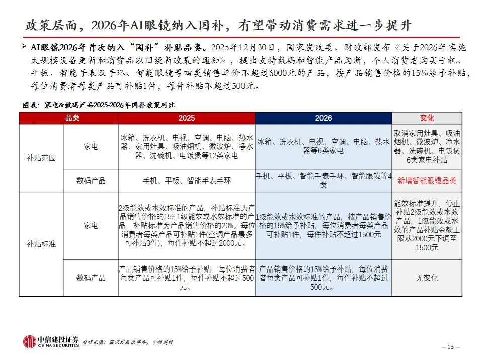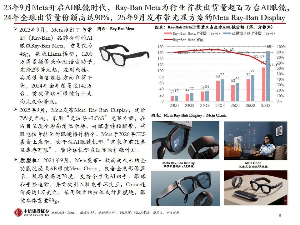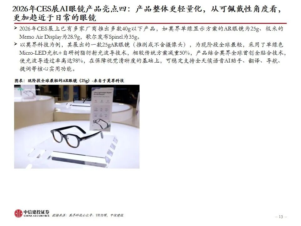 复盘AI眼镜行业发展及近况:AI眼镜将AI技术与传统眼镜形态结合,或为未来AI在C端最佳落地硬件载体之一,目前主流产品包括AI音频眼镜、AI拍摄眼镜、带显示屏的AI AR眼镜。2023年9月Meta开启AI眼镜时代,其发布的Ray-Ban Meta为行业首款出货量超百万台的AI眼镜。2025年AI眼镜进入产品爆发期,行业“百镜争鸣”,主要参与者包括XR科技企业、AI眼镜创业企业、互联网巨头、手机大厂、跨界企业等,海内外科技公司加码研发,预计谷歌、苹果等大厂AI眼镜产品将在2026-2027年陆续推出。2026年CES展会上,AI眼镜百花齐放,仍有大量新玩家进场,产品整体呈现出独立终端能力突破、多芯片方案、轻量化设计、垂类场景深耕、换电续航等趋势。政策层面,2026年AI眼镜纳入国补,有望带动消费需求进一步提升。