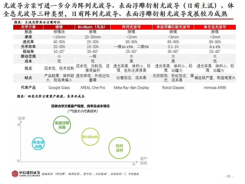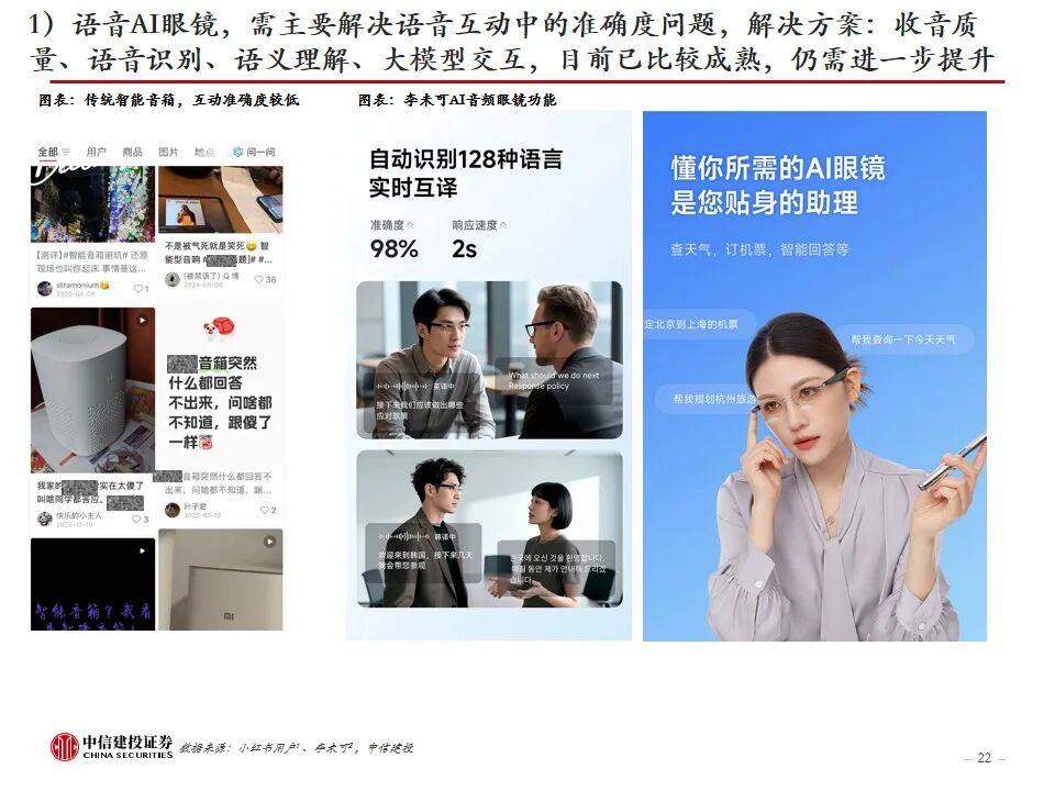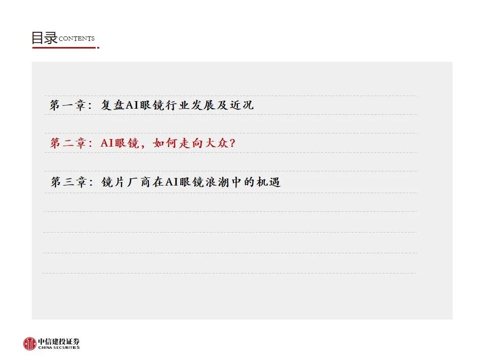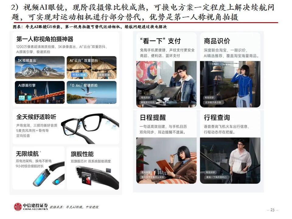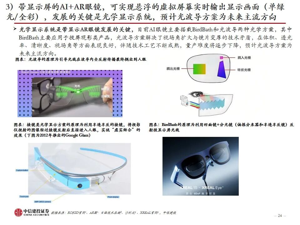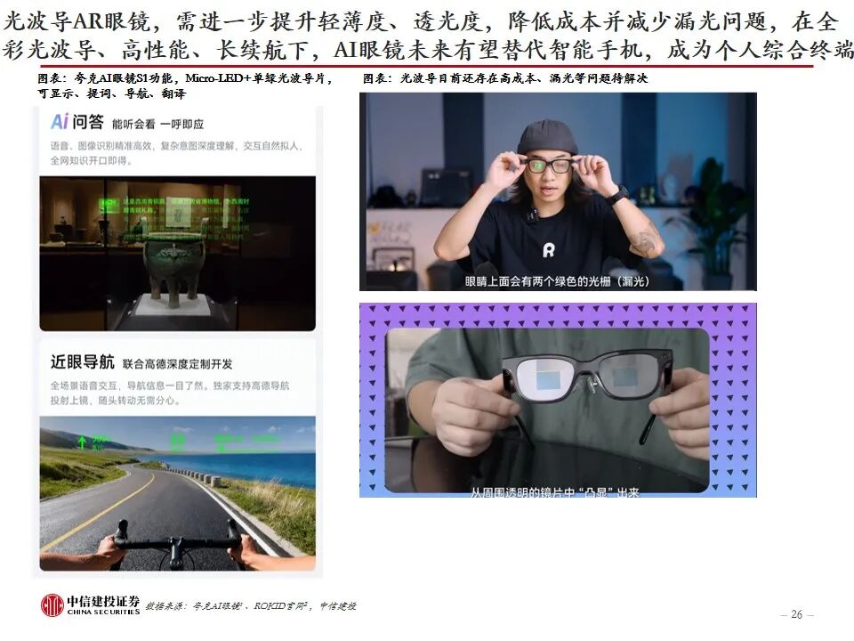 AI眼镜,如何走向大众?当前AI眼镜面临“不可能三角”,即性能、重量、续航难以兼顾,及平衡各方面所带来的成本挑战。目前市场上AI眼镜在成本、重量、性能、续航多方面有所取舍,不同类型的AI眼镜有各自侧重的功能,如观影、音频、拍摄、专业等。AI音频眼镜和AI拍摄眼镜目前已经较为成熟,实现对TWS耳机、运动相机的部分替代,带显示屏的AI AR眼镜尚在发展阶段,光学显示系统是关键环节之一,预计光波导方案为未来主流方向。从消费者视角看,AI眼镜走向大众,需要进一步提升性能(实现全功能,提升软硬件效果、AI交互功能)、提高续航能力、减轻重量(30g以内)、降低价格。我们认为,待技术成熟时,具备全彩显示、高性能、长续航的AI眼镜未来有望替代智能手机,成为个人综合终端。