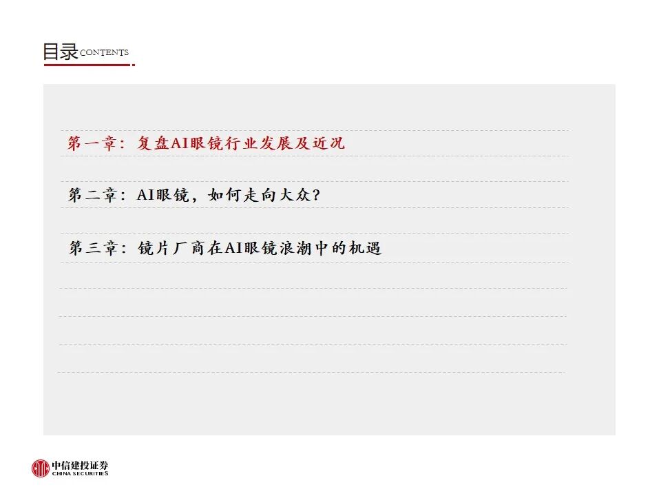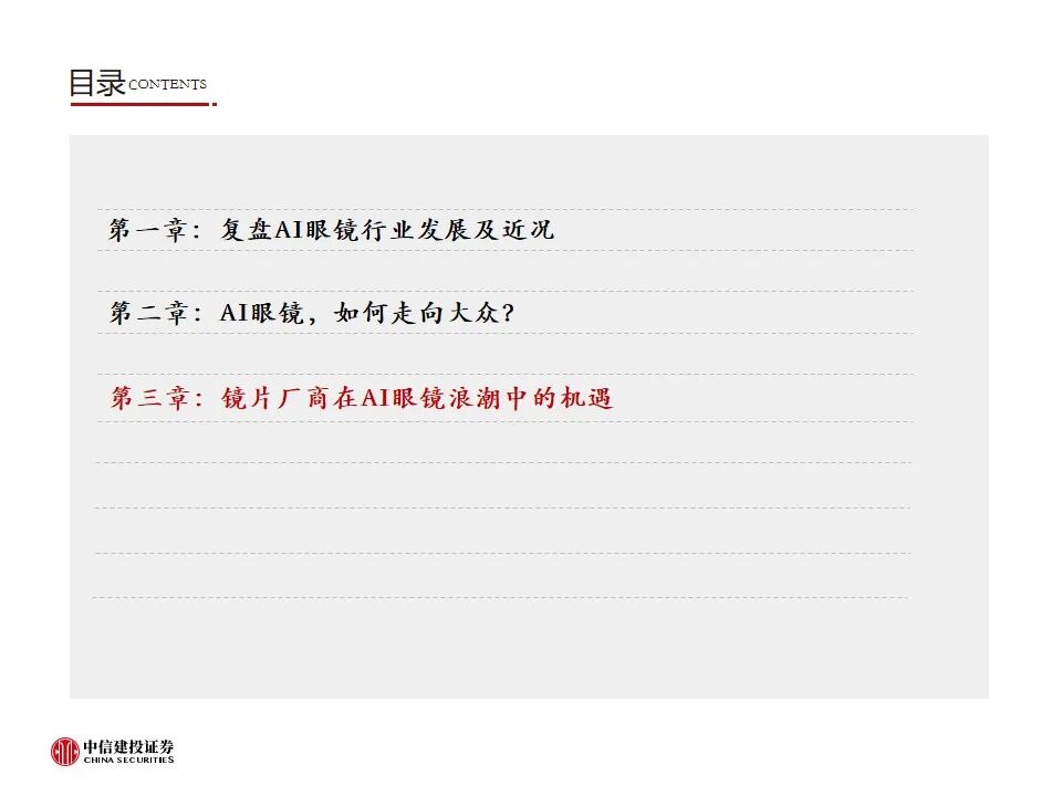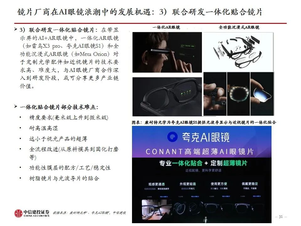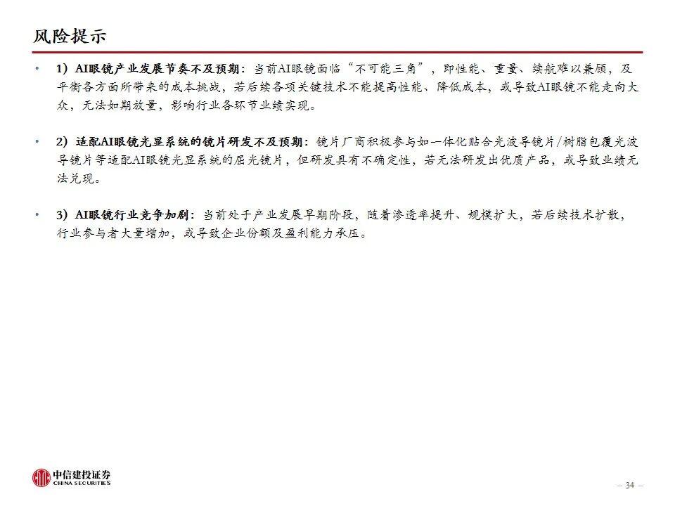 2)适配AI眼镜光显系统的镜片研发不及预期:镜片厂商积极参与如一体化贴合光波导镜片/树脂包覆光波导镜片等适配AI眼镜光显系统的屈光镜片,但研发具有不确定性,若无法研发出优质产品,或导致业绩无法兑现。