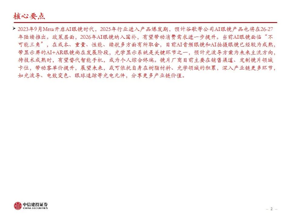 2023年9月Meta开启AI眼镜时代,2025年行业进入产品爆发期,预计谷歌等公司AI眼镜产品也将在26-27年陆续推出。政策层面,2026年AI眼镜纳入国补,有望带动消费需求进一步提升。当前AI眼镜面临“不可能三角”,在成本、重量、性能、续航多方面有所取舍,目前AI音频眼镜和AI拍摄眼镜已经较为成熟,带显示屏的AI AR眼镜尚在发展阶段,光学显示系统是关键环节之一,预计光波导方案为未来主流方向,待技术成熟时,有望替代智能手机,成为个人综合终端。镜片厂商目前主要在销售渠道、定制镜片领域卡位,带动客单价提升,展望未来,或可依托自身在树脂材料、光学领域的积累,深入产业链更多环节,如光波导、电致变色、眼球追踪等光电元件,分享更多产业链价值。