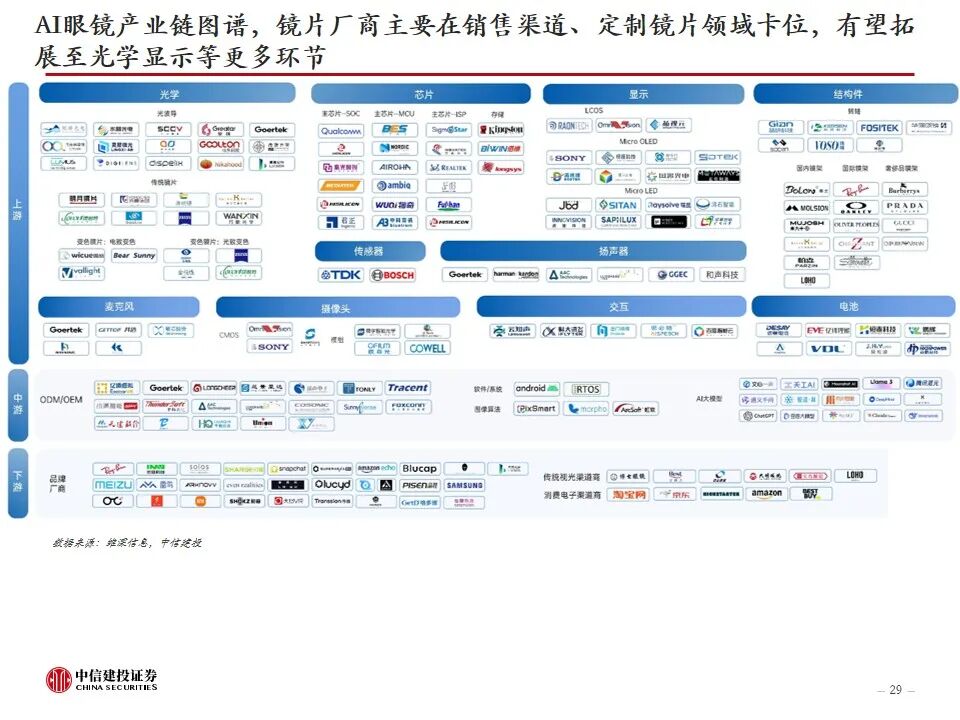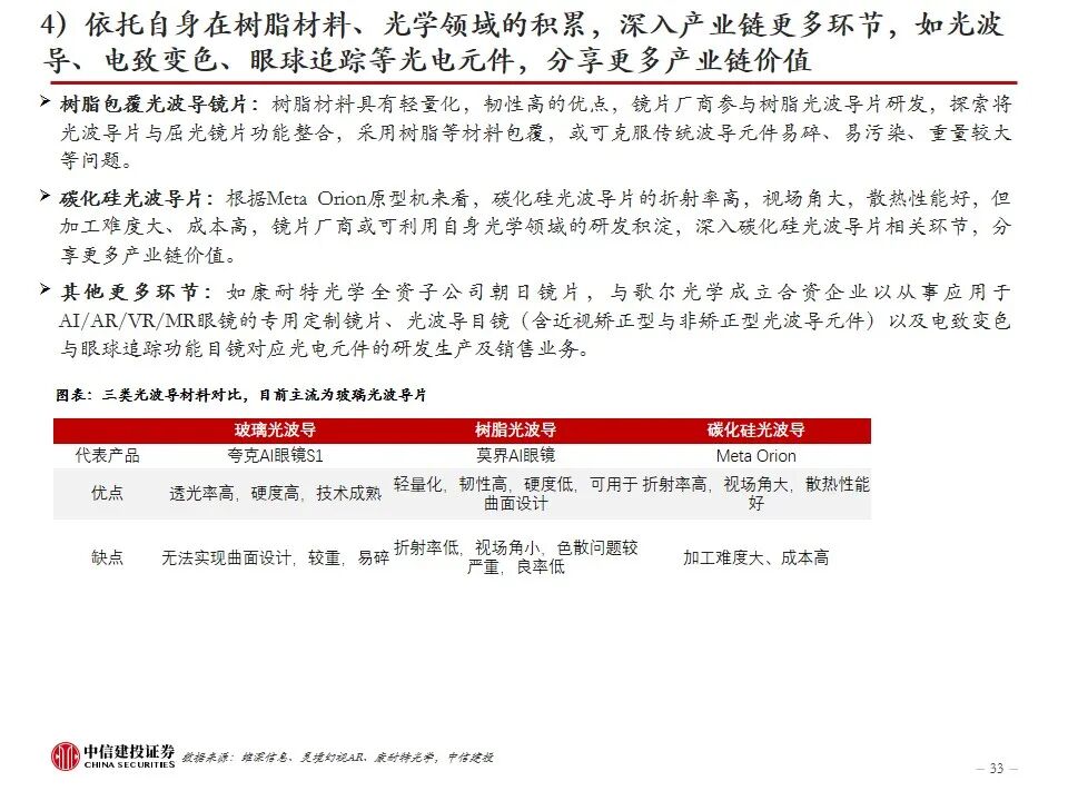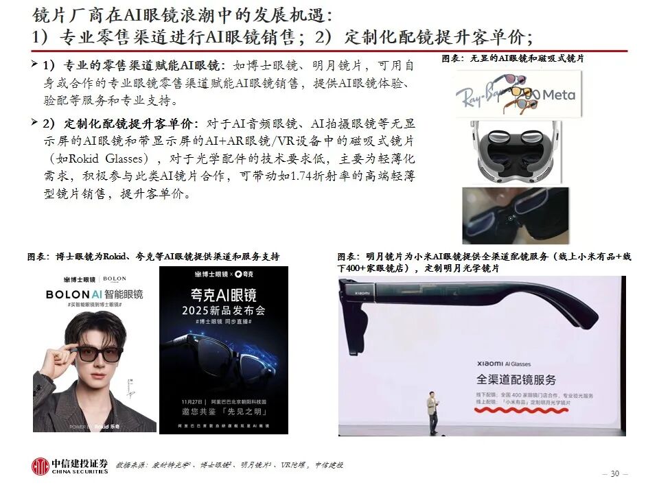 镜片厂商在AI眼镜浪潮中的机遇:1)可利用自身或合作的专业眼镜零售渠道赋能AI眼镜销售,提供AI眼镜体验、验配等服务和专业支持;2)迎合AI眼镜屈光镜片的轻薄化需求,定制化配镜提升客单价;3)在带显示屏的AI AR眼镜中,为光波导片提供联合研发的一体化贴合镜片;4)依托自身在树脂材料、光学领域的积累,深入产业链更多环节,如光波导、电致变色、眼球追踪等光电元件,分享更多产业链价值。
