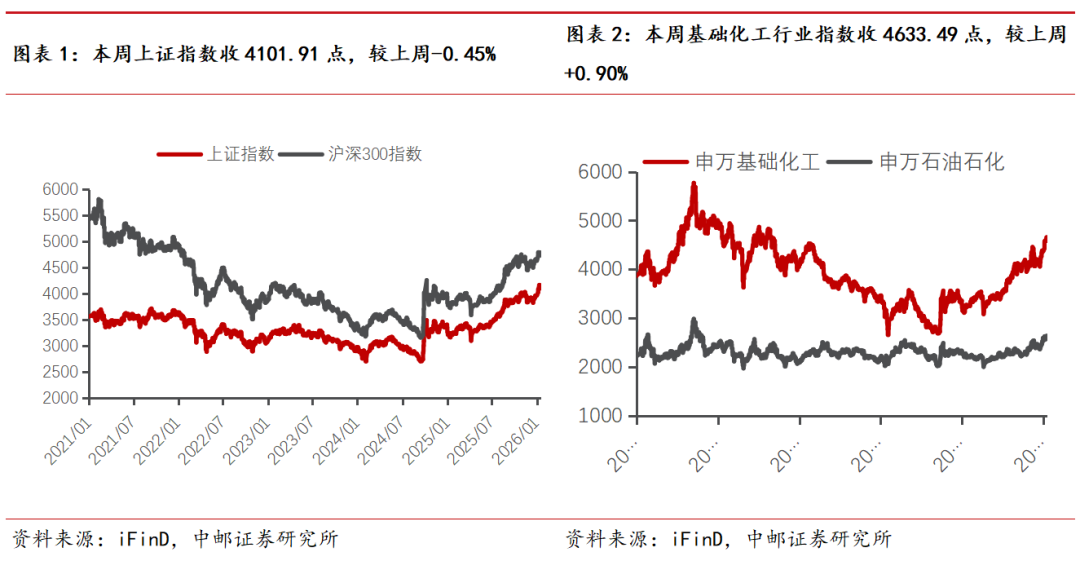 整体看,截至本周五(1月16日),上证综指收于4101.91点,较上周五的4120.43点下跌0.45%;沪深300指数报4731.87点,较上周五下跌0.57%;申万化工行业指数报4633.49点,较上周五上涨0.90%;本周化工行业指数跑赢沪深300指数1.47%。