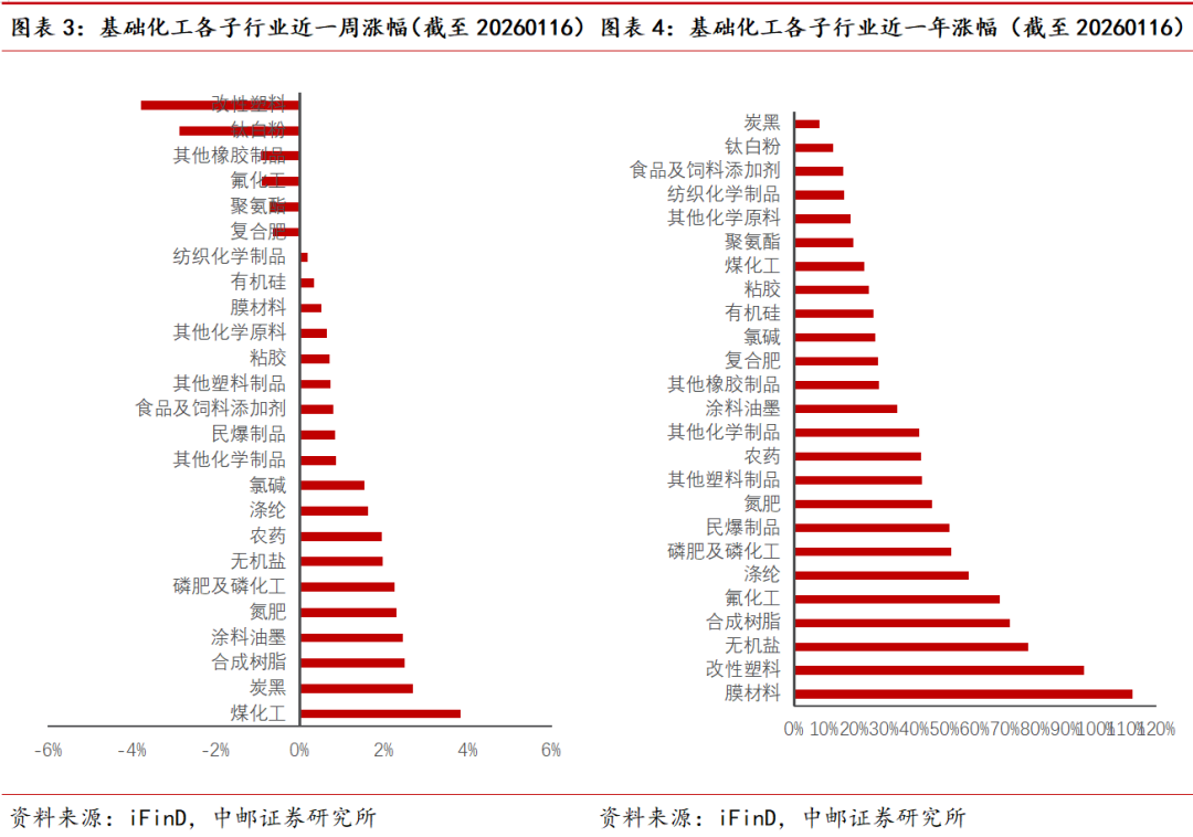 本周基础化工行业指数收4633.49点,较上周 0.90%,跑赢沪深300指数1.47%。细分子行业看,截至本周五(1月16日),申万化工三级分类中19个子行业收涨,6个子行业收跌。其中,煤化工、炭黑、合成树脂、涂料油墨、氮肥行业领涨、周涨幅分别为3.82%、2.70%、2.49%、2.46%、2.31%;改性塑料、钛白粉、其他橡胶制品行业走跌,周跌幅分别为-3.78%、-2.85%、-0.93%。