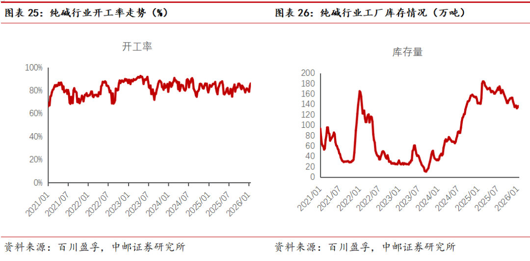 供应方面:截至2026年第2周,据百川盈孚统计,中国国内纯碱有效产能共计4135万吨(共22家联碱工厂,运行产能共计2010万吨;11家氨碱工厂,运行产能共计1435万吨;以及4家天然碱工厂,产能共计690万吨)。四川和邦,2025年5月22日老线30万吨装置停车检修,暂未恢复;杭州龙山,纯碱装置降负运行,恢复周期暂未确定;冷水江金富源,2025年6月26日起,纯碱装置停车检修,计划2026年1月17日左右点火开车;陕西兴化,2025年6月28日起,纯碱装置停车检修,恢复周期待定;安徽德邦,2025年7月8日起纯碱装置停车检修,暂未恢复;金昌化工,2025年7月26日纯碱装置停车检修,9月1日装置重启恢复,现装置负荷不满;天津渤化,2025年10月9日纯碱装置停车检修,12月20日重启,现装置负荷不满;重庆和友,11月10日起纯碱装置停车检修;河南金山,2025年12月3日起纯碱装置降负运行,本周恢复正常运行;中盐昆山,12月16日起纯碱装置降负运行,暂未恢复;五彩碱业,2026年1月13日纯碱装置减量检修,恢复周期待定。截至目前,本周整体纯碱行业开工率为86.18%,较上周相比上涨2.53%。