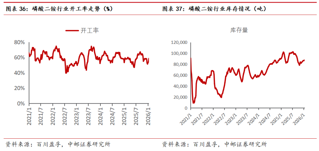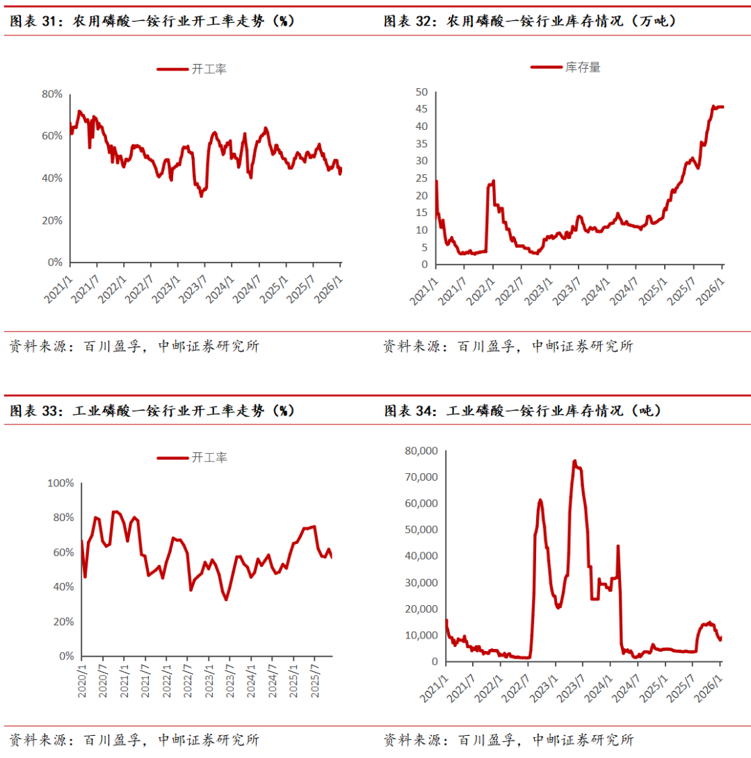 工业磷酸一铵:工业级磷铵市场价格小幅下跌,场内新单零星成交。截至本周四(1月15日),国内73%工业级磷酸一铵市场均价为6496元/吨,较上周同期价格(6507元/吨)下跌11元/吨,跌幅为0.17%。供应方面:据百川盈孚不完全统计,预计本周工业级磷铵(2026.1.9-2026.1.15)期间,周度产量约6.38万吨,较上周(6.29万吨)产量增加。工业级磷铵行业开工率至57.91%,环比上周四(55.82%)开工率上涨。整理来看,本周华中地区产量较上周相比有所上涨,其主要原因为个别企业装置现阶段稳定运行,产出量较前期稳定;西南地区个别企业装置停车检修,区域供给量稍有减少。需求方面:近期下游需求端呈现按需补货态势,市场整体商谈氛围较为平淡。农业需求方面,春节前集中囤货已基本结束,当前多数业者转为观望,采购积极性不高。而在新能源领域,虽有部分补货需求显现,但下游客户询单时普遍压价意向较强,实际成交多以低价商谈为主。受此影响,个别工业铵生产企业为促成新订单,让利出售意愿增强,价格出现松动。整体来看,市场维持刚需成交,交投活跃度一般。