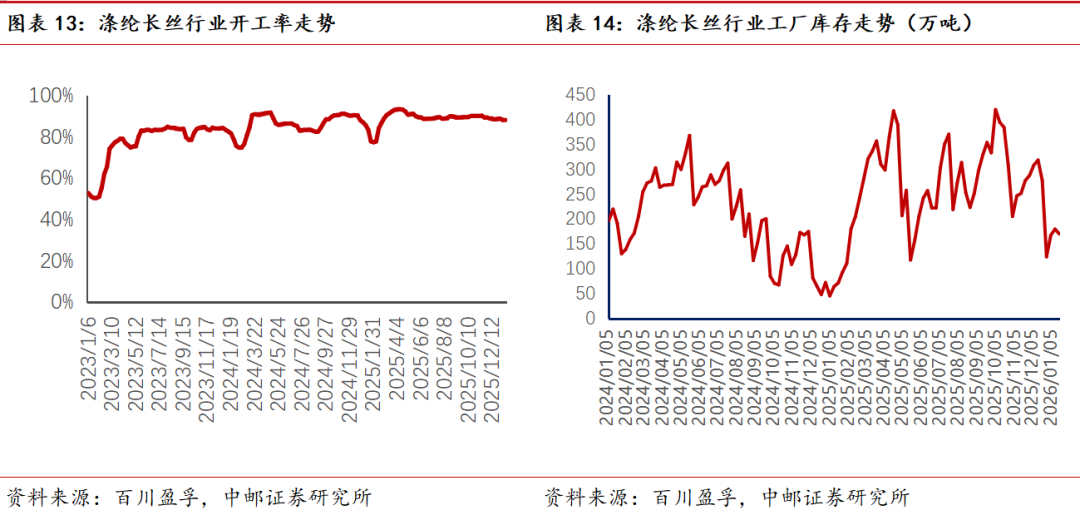 市场综述:本周(2026年1月9日-2026年1月15日)涤纶长丝市场价格上涨,截至本周四,涤纶长丝POY市场均价为6670元/吨,较上周均价上涨120元/吨;FDY市场均价为6890元/吨,较上周均价上涨140元/吨;DTY市场均价为7780元/吨,较上周均价上涨30元/吨。本周伊朗供应忧虑支撑,国际油价全面拉涨,成本支撑表现尚可,与此同时,长丝已有部分企业提前开启春节检修计划,叠加主流工厂宣布进一步追加减产,长丝市场供应量逐步下滑,进一步支撑价格,长丝市场重心稳步回升,然需求端订单稀少,季节性淡季愈发浓郁,叠加采购成本不断攀升,下游用户对于高价原丝难以跟进,刚需适量采买为主,长丝市场成交气氛清淡,仅市场局部区域存优惠松动,即日产销数据才得以短暂升温,据反馈采购客户也多为节后复工生产适量备货为主。现阶段长丝市场供需双降,上下游表现较为僵持,多空博弈下,市场横盘窄幅调整为主。