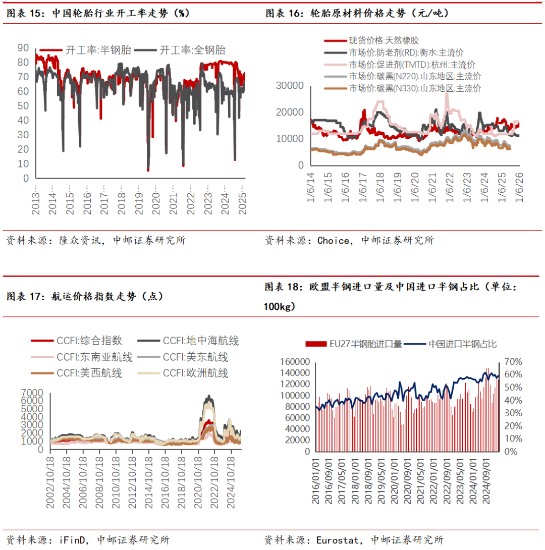 (6)欧美轮胎价格:2025年9月,美国从东南亚进口轮胎的单价为47.20美元/条,同比-6.43%,环比-2.62%,从其他地方进口的轮胎单价为91.18美元/条,同比-3.98%,环比-2.94%。2025年10月,欧盟进口轮胎价格为3760欧元/吨,同比-7.58%,环比 2.48%,其中从中国和泰国进口轮胎的价格分别为3037、1674欧元/吨,同比分别-10.78%,-46.76%,环比分别-2.22%、-41.70%。