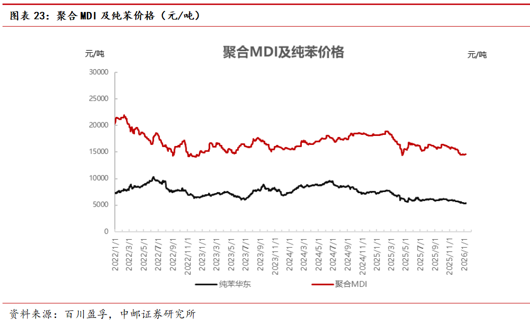 (1)市场走势:本期聚合MDI市场价格连续小幅下调。纯苯价格上调4.89%,苯胺价格上调5.57%。截至1月15日收盘,聚合MDI国内市场上海货源价格在13800-13900元/吨。