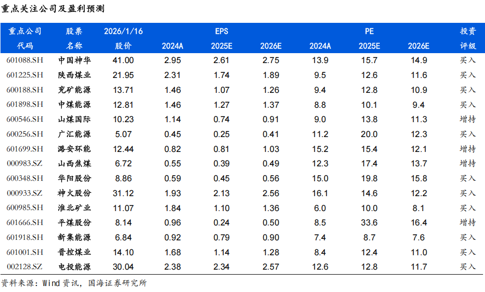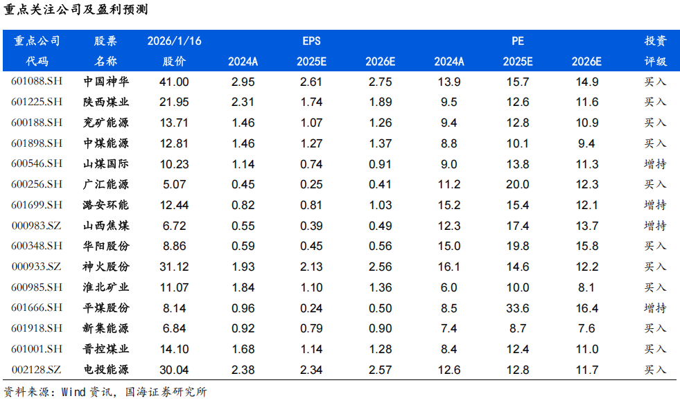 美国关税新政落地对市场情绪构成一定冲击,市场寻求稳健性资产,煤炭高股息、现金奶牛的投资价值属性值得关注。同时2025年国家能源集团、山东能源集团、中国中煤能源集团等多家煤炭央国企对旗下上市公司启动增持与资产注入计划,亦释放利好,彰显煤企发展信心、增厚企业成长性与稳定性。从大方向来看,煤炭开采行业供应端约束逻辑未变,需求端可能阶段性起伏波动,价格亦呈现一定震荡和动态再平衡。复盘行业30年经验,煤炭价格呈现震荡向上趋势,背后的驱动因素包括人工成本刚性上涨,安全投入、环保投入的持续加大,原材料动力等大宗商品涨价,以及地方政府加大征税力度等,从行业发展大趋势来看,上述驱动因素依然存在,煤价长期内仍然有上涨的诉求,过程可能是曲折的,但是方向应该是明确的。头部煤炭企业资产质量高,账上现金流充沛,呈现“高盈利、高现金流、高壁垒、高分红、高安全边际”五高特征。建议把握低位煤炭板块的价值属性,维持煤炭开采行业“推荐”评级。重点关注:(1)稳健型标的:中国神华、陕西煤业、中煤能源、电投能源、新集能源。(2)动力煤弹性较大标的:兖矿能源、晋控煤业、广汇能源、力量发展。(3)焦煤弹性较大标的:神火股份、淮北矿业、平煤股份、潞安环能、山西焦煤供给端,12月生产、进口同比分化,整体供给较11月提升。12月原煤产量4.4亿吨,同比下降1.0%,降幅相较11月扩大0.5pct,煤炭进口同比 11.9%,降幅较11月放大31.8pct,整体看供给同比上升。需求端,12月整体需求下滑,主要系火电下滑拖累,化工、冶金仍录得正贡献。12月规上火电发电同比-3.2%,降幅较11月收窄1.0pct;化工耗煤同比 8.41%,同比增速较11月扩大0.19pct,焦炭产量同比 1.90%,同比增速较11月收窄0.4pct。库存端,北港库存累高,12月北方港口动力煤库存提升130.8万吨至2,840.6万吨,同比提升286万吨。整体来看,12月供需偏宽松,港口库存同比偏高,煤价环比下行,12月秦皇岛5500大卡港口煤价均价731元/吨,环比11月下降90元/吨。展望后续,春节前供应仍有趋紧预期,需求端寒潮天气即将来临叠加春节前补库预期,供需有望改善,动力煤价格存在支撑。中期维度来看,保供产能政策是否有变化,对行业供需平衡表或将产生较大影响。