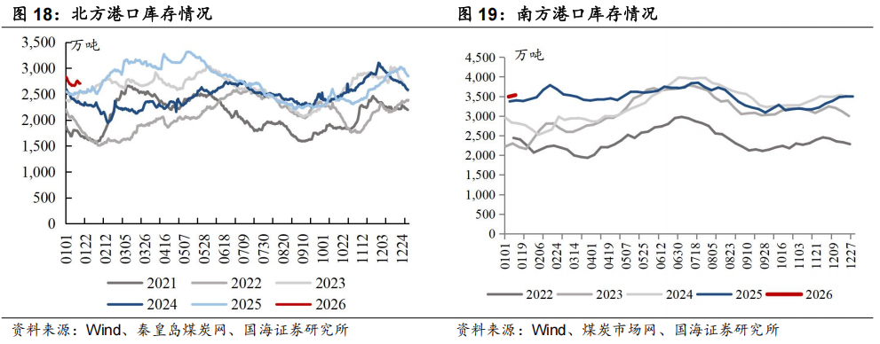样本大型煤企12月煤炭生产同比均有收紧。我们以中国神华、陕西煤业、中煤能源、潞安环能为样本。2025年12月,中国神华商品煤产量为2780万吨,同比-5.4%;陕西煤业煤炭产量为1474万吨,同比-1.0%;中煤能源商品煤产量为1091万吨,同比-8.0%;潞安环能原煤产量为468万吨,同比-12.0%。整体看,样本公司煤炭产量同比均有收紧。