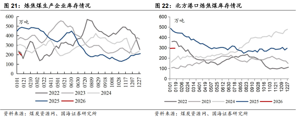2025年12月底较月初,炼焦煤生产企业库存环比上升20.22万吨至211.74万吨,仍处同期较低水平;北港焦煤库存环比上升6万吨至295.05万吨;焦化厂炼焦煤库存上升6.11万吨至295.05万吨;钢厂炼焦煤库存上升3.21万吨至528.68万吨。