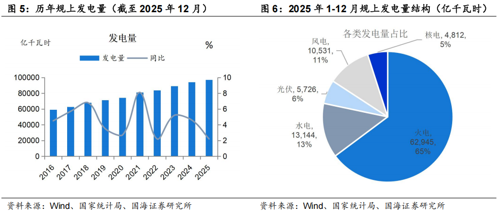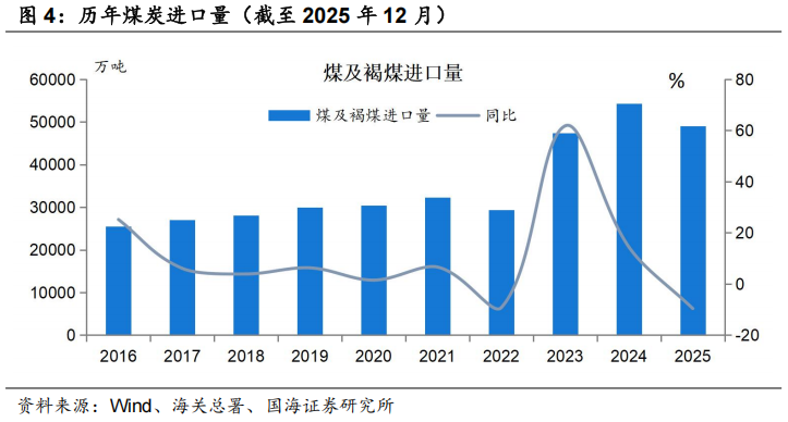 12月煤炭进口同比 11.90%,增幅较11月放大31.8pct,增幅超市场预期与进口煤性价比、印尼征收出口关税预期下海外供应商抢运等因素有关。2025年12月,我国进口煤炭5,860万吨,同比 11.90 %,增幅较11月放大31.8pct,创历史新高,主要系临近年底国内供应阶段性收紧之下,仍存价格优势的进口煤具补充效应,且印尼2026年征收出口关税预期下海外供应商加紧抢运所致。2025年1-12月煤炭进口4.9亿吨,同比-9.60%。