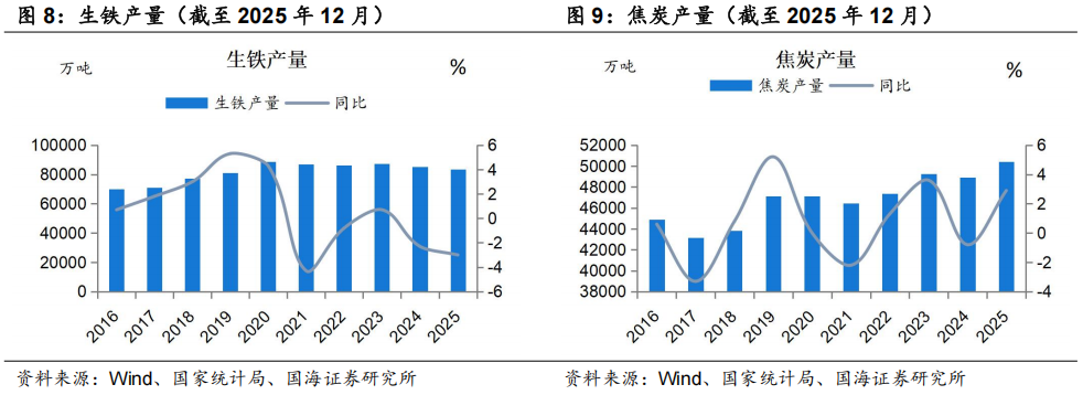 2025年12月,我国实现生铁产量6,072万吨,同比-9.9%,降幅较上月扩大1.2pct;焦炭产量4,274万吨,同比 1.9%,增幅较上月放缓0.4pct。2025年1-12月,我国实现生铁累计产量83,604万吨,同比-3.0%;焦炭产量50,412万吨,同比 2.9%。