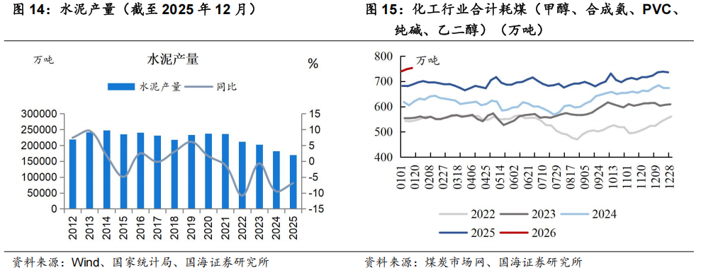 2025年12月,全国水泥产量1.44亿吨,同比-6.6%,同比降幅相较11月减缓1.6pct;化工行业合计耗煤(甲醇、合成氨、PVC、纯碱、乙二醇)2932.16万吨,同比 8.41%,同比增速较11月放大0.19pct;2025年1-12月,全国水泥产量16.93亿吨,同比-6.90%,同比降幅相较1-11月持平;化工行业合计耗煤(甲醇、合成氨、PVC、纯碱、乙二醇)36219.49万吨,同比 11.54%,同比增速较1-11月放缓0.28pct。