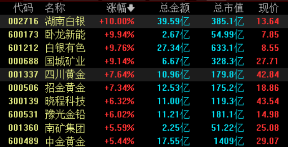 港股黄金股涨幅居前,截至发稿,灵宝黄金涨超10%,中国黄金国际涨6%,大唐黄金、山东黄金涨超5%。