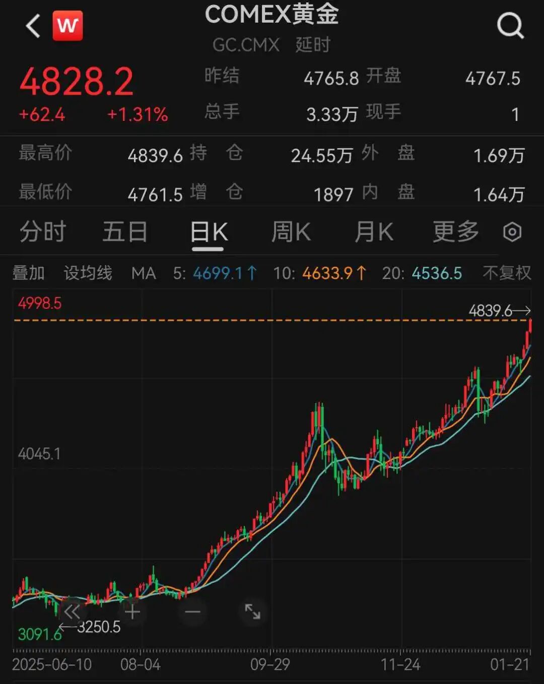 国际黄金期货价格和现货价格均再创新高,突破每盎司4800美元。