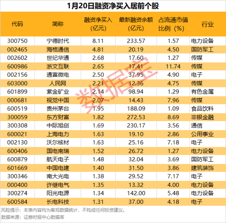 具体到个股,1月20日融资净买入在千万元以上的有429只,其中30只融资净买入额超亿元。宁德时代融资净买入额居首,当日净买入8.11亿元,其次是海格通信、世纪华通,融资净买入金额分别为4.81亿元、2.68亿元,融资净买入金额居前的还有浙文互联、通富微电、人民网等。