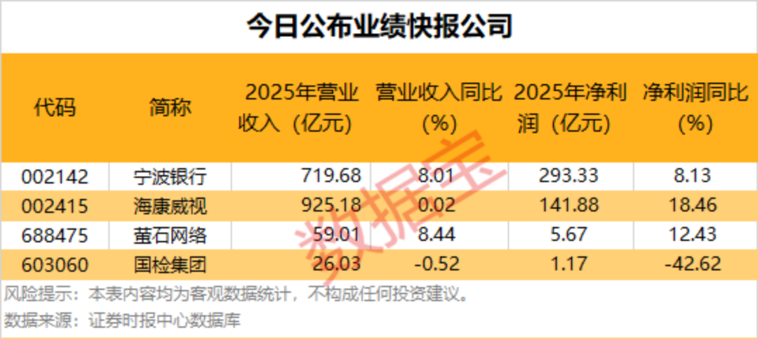 上市公司业绩密集公布,今日共4家公司公布业绩快报,宁波银行、海康威视2025年净利润均超百亿元。
