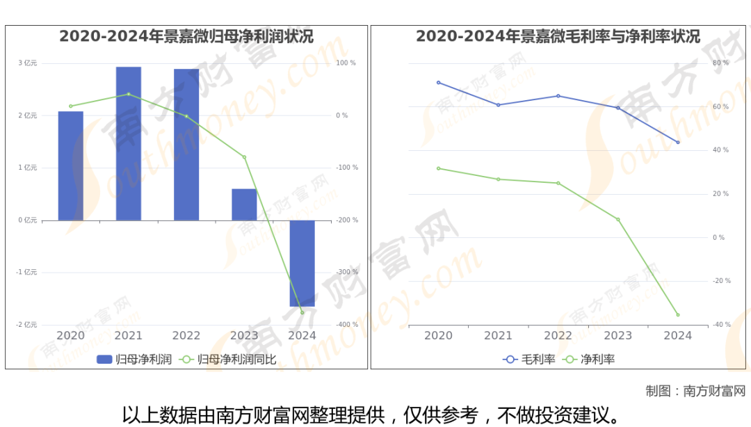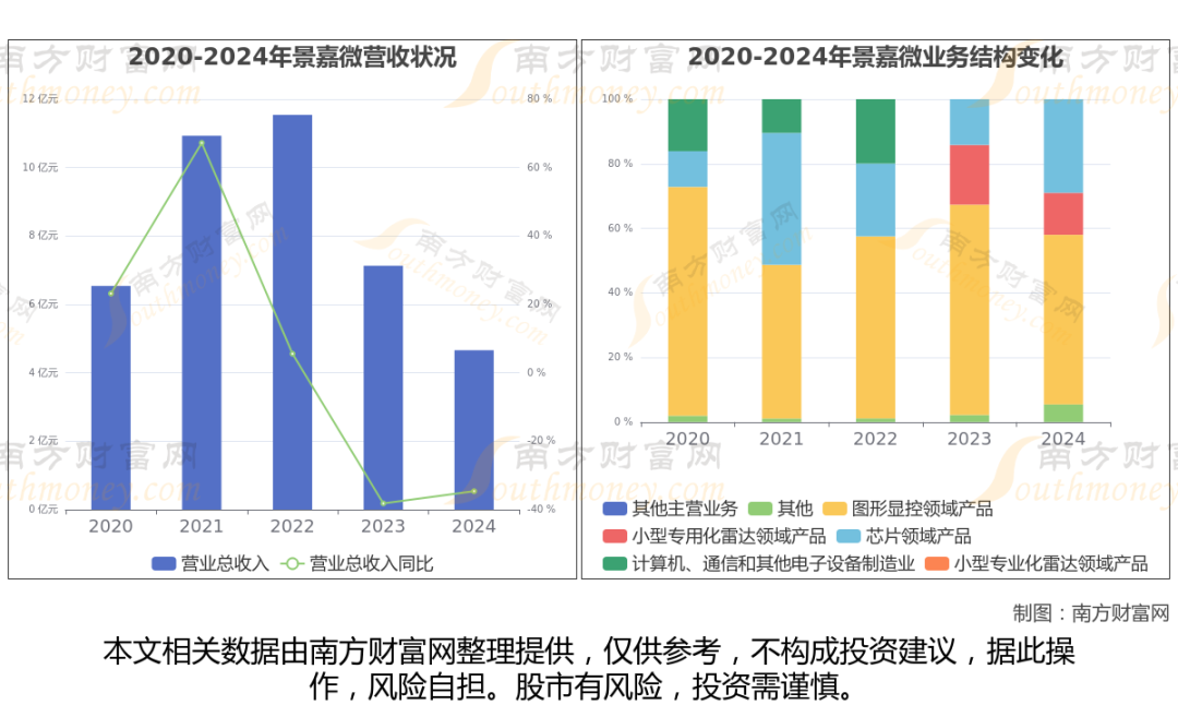 根据公司年度数据显示(如上图),2024年,景嘉微实现营业总收入4.66亿,同比增长-34.62%,近5年复合年增长率-8.1%。