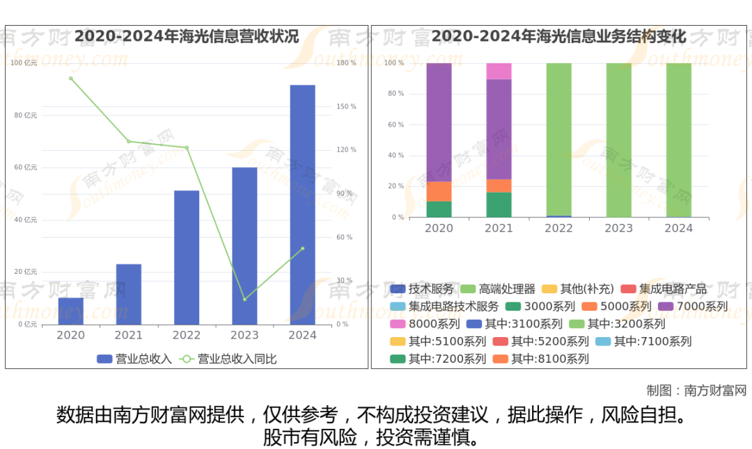 海光信息2024年数据显示(如上图),公司2024年营业收入91.62亿,同比增长52.4%,近五年复合年增长率73.04%。
