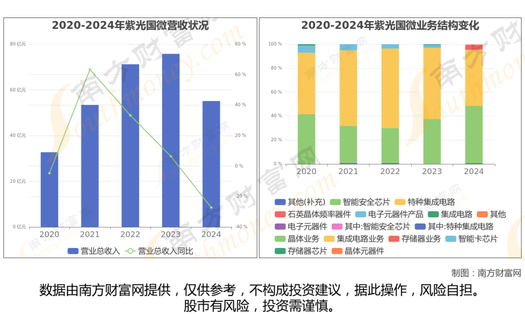 (如上图)紫光国微2024年全年营业收入为55.11亿,同比增长-27.26%,近五年复合年增长率13.94%。