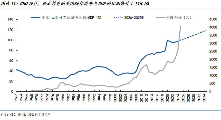黄金的对立面是美元信用,长期来看金价的上涨趋势与美国债务规模存在正相关性。据美国国会预算办公室(CBO)预测,到2035年,公众持有的美国联邦债务总量与美国GDP的比值将从2025年的97.8%上升至118.5%,超过二战结束时的高点,这一背景下黄金牛市仍有想象空间。除非这一过程中,出现了AI技术能够从组织和架构层面带来各行业生产率的全面提升,并带领美国重新走出滞胀、改善经济和财政效率,那么即是黄金牛市终止的信号。