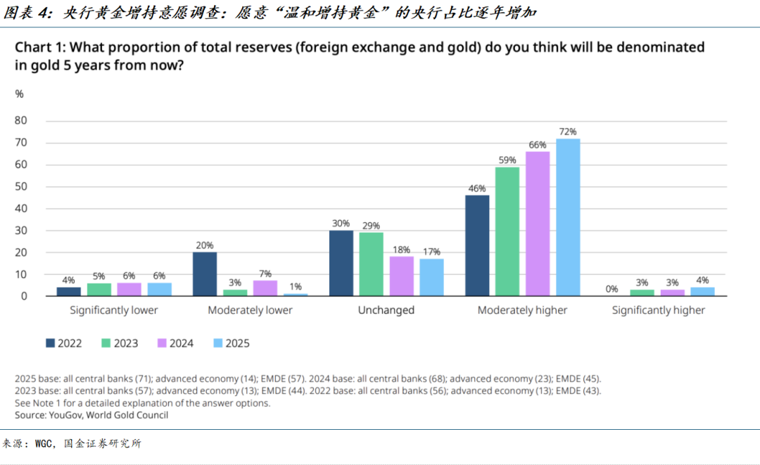 2025年世界黄金协会对央行黄金储备的调查结果显示,76%的受访央行表示未来5年黄金储备占比将继续“温和上升(Moderately higher)”(2022年为46%,2023年为62%,2024年为69%),黄金在危机时期的表现、组合多元化、以及对冲通胀的诉求是他们增持黄金最核心的理由。
