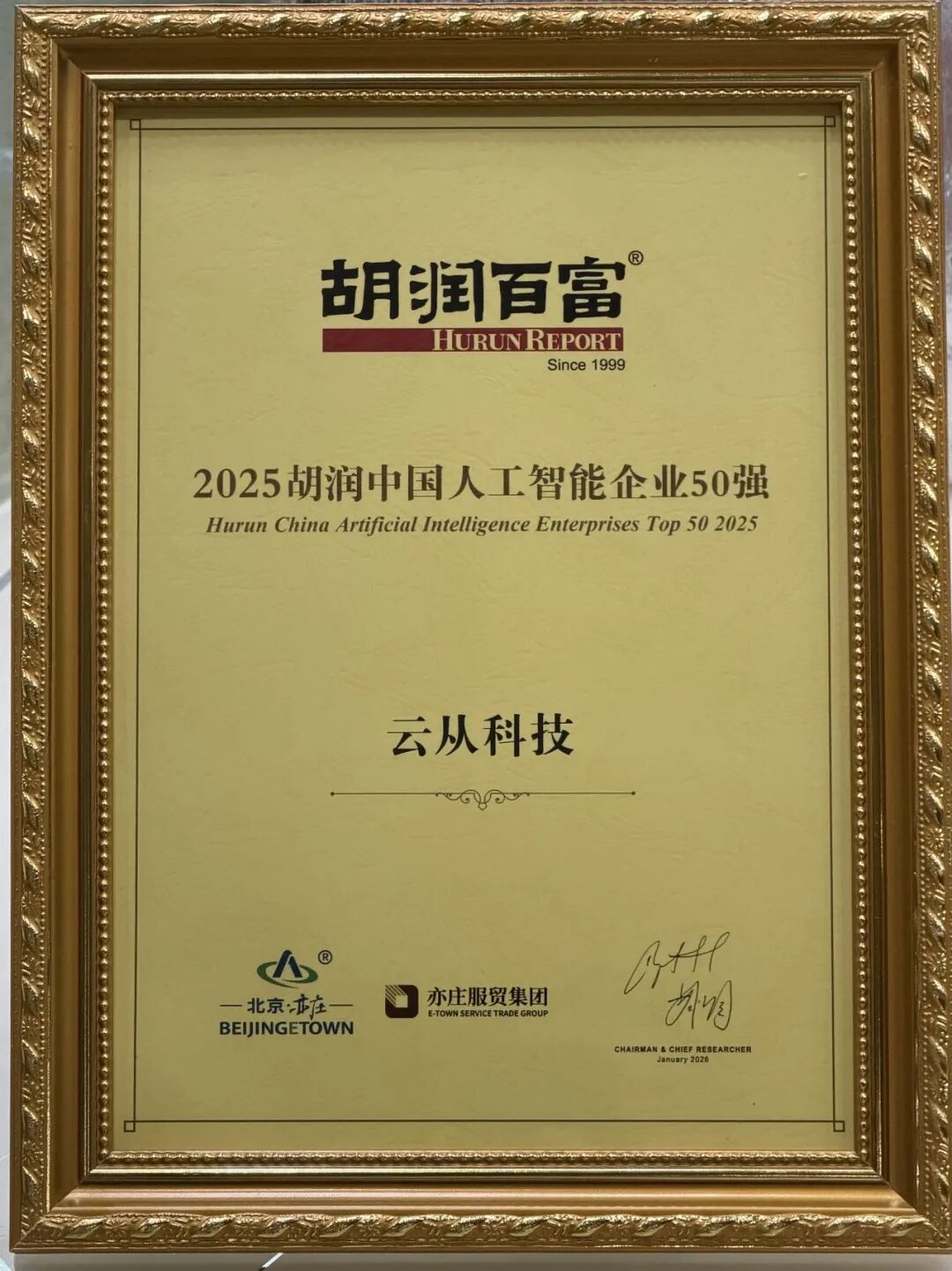 近日,胡润研究院发布《2025 胡润中国人工智能企业 50 强》榜单。云从科技与寒武纪等优秀企业一同凭借在人工智能核心技术、AI Infra体系建设及规模化产业落地方面的综合实力,入选该榜单。 这也是云从科技连续第二年入选。 在人工智能产业快速演进、企业分化加剧的背景下,能够连续上榜,往往意味着企业已穿越单一技术周期,形成相对稳定、可持续的技术体系与产业能力。 业内人士认为,该榜单正逐步成为观察中国 AI 产业真实竞争力的重要风向标。云从科技的持续入选,源于其在核心技术路径上的长期投入。在国际权威评测平台OpenCompass最新发布的全球榜单中,云从“从容”多模态大模型以80.7分的成绩刷新纪录,在中文理解、高阶推理等关键指标上表现突出。 与单纯追求模型参数规模不同,云从科技近年来更加注重模型能力向系统能力的转化。在技术研发之外,公司深度参与人工智能标准体系建设,牵头起草多项国家标准,推动人工智能从算法创新走向规则共建。 技术创新之外,公司深度参与行业规则制定,牵头起草多项人工智能国家标准,完成从算法研发到行业规范输出的跨越。 2025年,云从科技推出的编程智能体CoSEFA入选软件工程领域国际顶级会议FSE 2025,该智能体可将代码安全性提升9.34%,进一步拓展了人工智能在高可靠性场景中的应用边界。 云从科技表示,随着人工智能进入2.0阶段,AI正从“工具属性”向“生产要素”转变,关键不在于单点能力突破,而在于是否具备支撑产业持续运行的系统化能力。 围绕这一判断,云从科技依托自主研发的“从容”大模型,构建起面向行业的AI增长操作系统,将复杂的人工智能能力封装为可扩展、可复制的数字生产力单元,降低行业应用门槛。 这使得云从在面对金融、医疗、制造等万亿级领域时,展现出了极强的商业穿透力——不再是单纯的项目交付,而是通过“操作系统级”的切入,让AI深度嵌入客户业务流程,实现平台化增长。 近年来,云从科技持续推进 AI 能力的平台化与工程化升级,在城市治理、工业制造、商业服务等多个领域实现规模化应用。 从支撑天津港打造全球首个港口大模型PortGPT,到联手嘉陵江实验室攻克具身智能“卡脖子”技术;从入选信通院“AI Infra十大标杆案例”,到深度参与国家网安基地训推一体化中心建设。 云从科技正通过“AI基础设施 行业智能体 具身智能”的铁三角布局,构建起一套难以逾越的竞争壁垒。目前,云从科技已服务国家电网、正浩创新、青山工业等众多垂直行业头部客户,成为高安全需求行业的首选服务企业。 胡润中国人工智能 50 强从技术创新、商业化进展、行业影响力等多个维度对企业进行综合评估。 连续两年入选,反映出云从科技在人工智能产业链中的角色,正在从单一技术提供者,向具备系统交付能力和产业理解深度的 AI 平台型企业演进。 云从科技表示,未来将继续围绕人工智能核心技术自主创新,深化智能体与实体经济的融合应用,在更多关键行业和复杂场景中推动人工智能形成可持续、可衡量的产业价值。