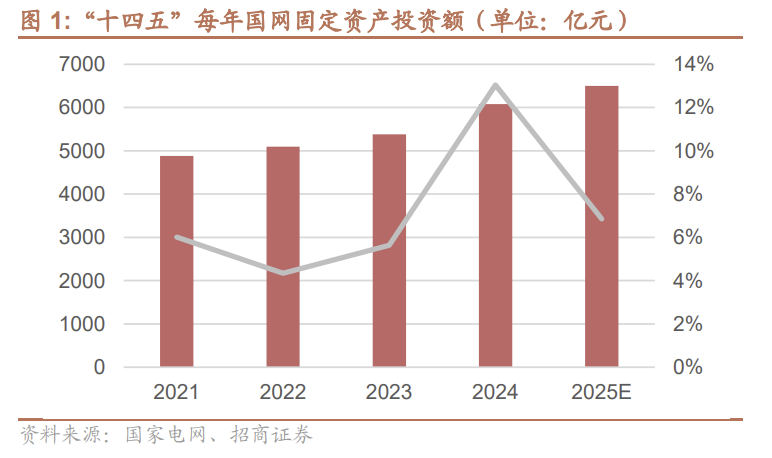 国网“十五五”投资规划超预期,行业景气度有望维持。“十五五”期间国家电网公司固定资产投资预计达到4万亿元,较“十四五”计划值大幅增长40%。我们测算,若以2025年国网固定资产投资6500亿元为基数,要完成“十五五”期间4万亿的总目标,隐含年化复合增速(CAGR)约7%,持平于“十四五”阶段(7.1%),实际落地可能更高。这标志着电网投资从“托底稳增长”转向“建设新型电力系统”的加速期,行业景气度有望贯穿“十五五”。