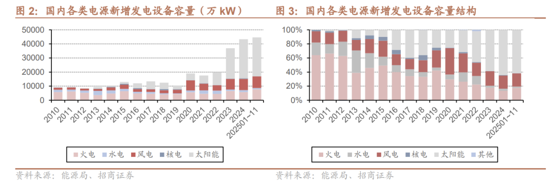 供给侧:新能源装机量井喷。“十四五”以来,风光大基地建设提速。据统计,截至2025年11月全国新增光伏装机275GW,新增风电装机82.5GW,占新增装机容量近8成。新能源发电具有显著的间歇性和波动性,当渗透率超过15%-20%临界点时,对电网的频率稳定和电压支撑能力提出巨大挑战。