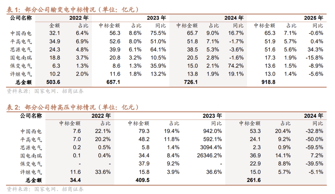 国内输变电和特高压主要公司格局较为稳定,中标金额整体呈现增长态势。