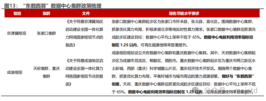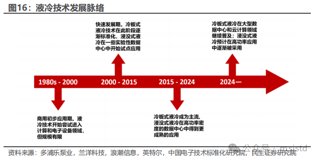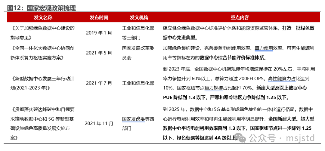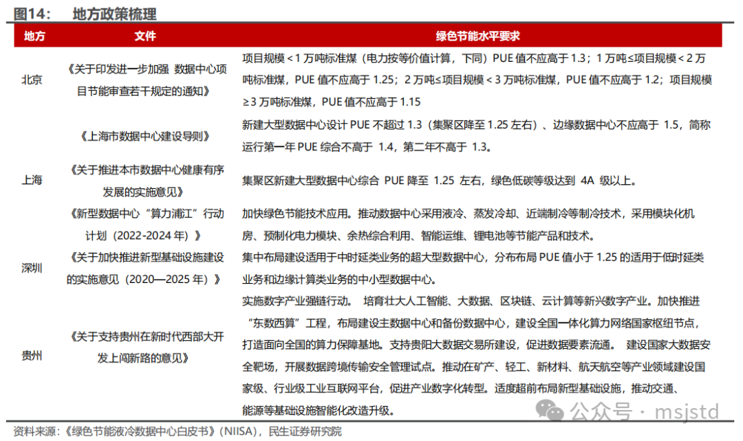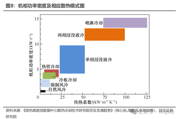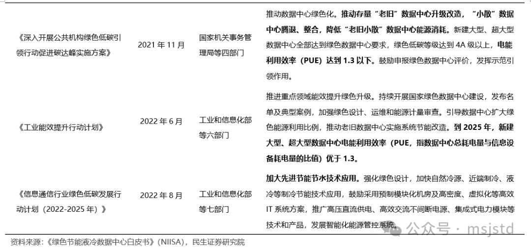 ◾ 算力快速发展带动散热需求提升,政策导向明确驱动液冷成为标配。伴随算力需求快速发展,处理器计算能力快速提升的同时功耗也显著提升,传统风冷已难以满足散热需求,需要更高换热效率、更节能的液冷技术来满足高功率散热需求。传统风冷的PUE值基本在1.5-1.6,而液冷能够将PUE值做到1.2甚至更低。2019年以来国内政策导向明确建设新型绿色数据中心,明确要求PUE值要做到1.3以下,液冷技术路径有望深度受益。