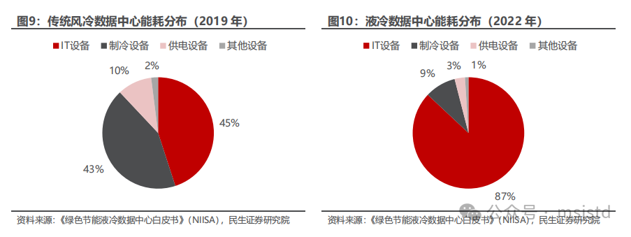 液冷技术路径可实现更低的PUE值。由于液冷数据中心冷却系统采用中高温水即可完成散热需求(一次侧进水温度35℃,二次侧供液温度40℃),可实现全年全地域自然冷却,而传统风冷方式冷冻水机组出水温度需低至15-20℃,在大部分地域、大部分时间段均需开启制冷压缩机才能满足条件,因此液冷方式省去大部分风扇及空调系统能耗,相比传统风冷机房节能20%-30%以上,冷板式液冷PUE低至1.2以下、浸没式液冷PUE低至1.1以下。