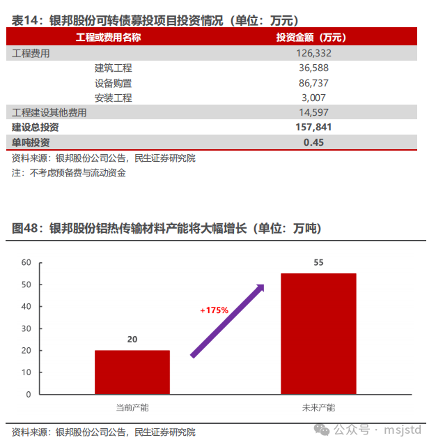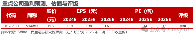 ◾ 投资建议:华峰铝业:公司作为国内铝热传输龙头企业,受下游新能源汽车渗透率提升和单车热传输用铝增长的趋势下持续扩张产能,在生产成本严格把控与复合材料议价能力强的基础上深度绑定下游优质客户,公司业绩未来可期。我们预计2024-2026年公司归母净利润为11.92、13.77、16.79亿元,对应2025年1月23日收盘价PE分别为16/14/12X,维持“推荐”评级。建议关注:银邦股份,东阳光。