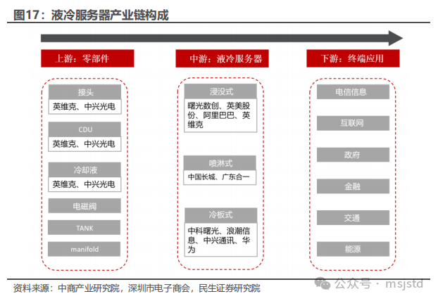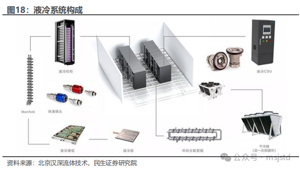 构成方面,液冷系统主要包括五部分:液冷服务器、液冷机柜、Manifold(分水管)、PDU(Power Distribution Unit,电源分配单元)以及CDU(Coolant Distribution Unit,冷液分配装置)。其中Manifold分水管主要用于连接液冷机柜CDU与冷板之间的主管路,CDU冷量温控单元作为液冷的重要组成部分,其核心主要由换热器构成,用于将二次侧(服务器侧)的热量交换到一次侧(冷却塔侧),再搭配水箱、水泵、过滤网、传感器等,构成相对独立的模块化的热交换模块。