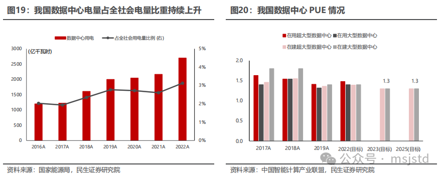 短期维度看,数据中心耗电量快速增长同PUE指标是主要矛盾,有望刺激液冷需求快速增长。根据国家能源局统计预测,2022年我国数据中心总耗电量约2700亿千瓦时,同比增长约24.7%,占全社会用电量比重近3.1%(较2022年提升0.5pct)。在能耗变高的同时,在用大型数据中心PUE也存在较大提升空间。根据《Uptime Institute 全球数据中心调查报告 2022》,2022年调查对象(全球范围数据中心样本)的年平均PUE为1.55,自2014年以来年平均PUE值维持在1.55-1.65范围内。目前宏观政策明确要求到2023年底新建大型及以上数据中心PUE降低到1.3以下;到2025年全国新建大型、超大型数据中心平均电能利用效率降到1.3以下,液冷技术路径可实现更低的PUE值,应用需求有望快速提升。