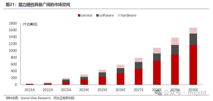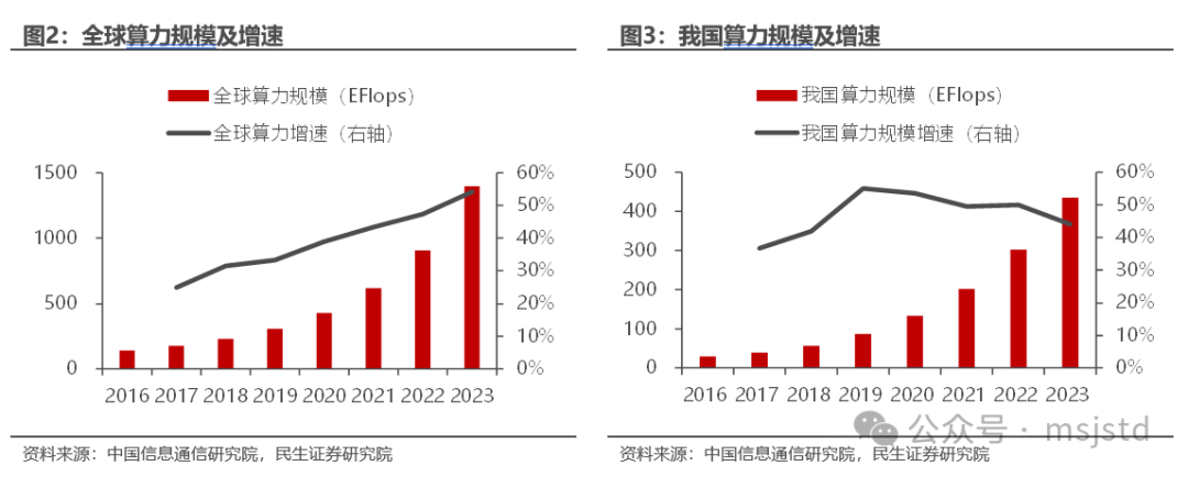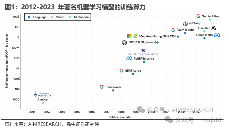 算力是AI发展的重要引擎。在人工智能的发展中,“算力”、“算法”与“数据”并称为AI发展的三大基石。算法相当于AI的大脑,是指导计算机执行特定任务的一系列指令的集合,是AI实现智能化处理的基础,从上个世纪以来算法已经历经了从最开始的逻辑推理模型到专家系统到神经网络再到深度学习的多次进化。数据是AI的燃料,是人工智能系统学习和改进的基础,通过收集、处理和分析海量数据,AI系统能够不断优化模型参数、提升预测准确率从而实现智能化决策和应用。算力,即“计算能力”,是指计算系统(如电脑、服务器、数据中心等)处理信息和执行计算的能力,是人工智能系统实现高效准确处理任务的物质基础。从数据收集、模型训练到推理应用,每一步都离不开强大的算力支持。现代人工智能,特别是深度学习技术,依赖于复杂的神经网络模型,这些模型包含数百万甚至数十亿的参数。训练这样的模型需要强大的计算资源,从而对算力需求大幅提升,只有足够的算力才能使模型在合理的时间范围内完成对海量数据的学习。随着AI技术的不断进步,对算力的需求预计呈现出指数级增长。