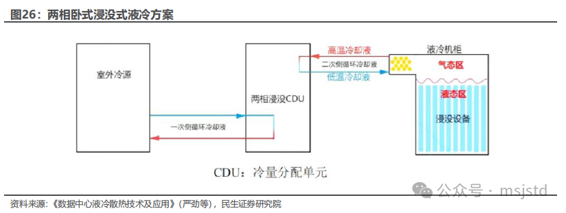两相立式浸没方案是浸没式冷却未来的主要方向。其原理是将每个设备节点作为一个独立的小型浸没腔体,可有效避免相变冷却液的 运维耗散问题,且架构兼容性更优、维护操作更便捷。