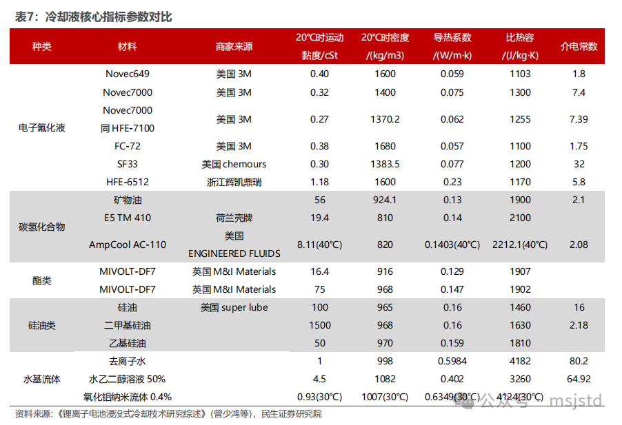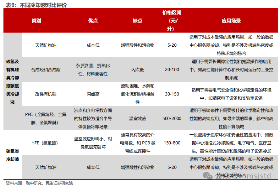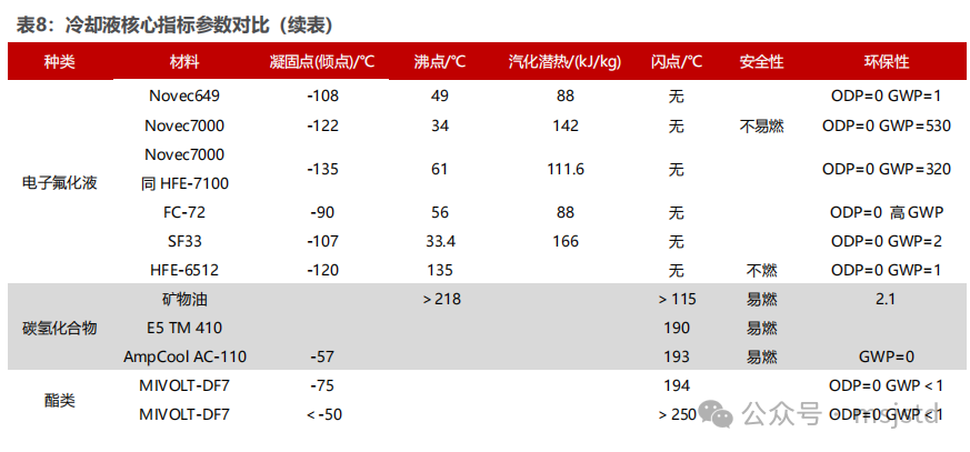 ◾ 冷板式方案是当下液冷方案的主流,浸没式方案与碳氟类冷却液大规模普及仍然需要降本驱动。根据热器件是否与冷却液接触,液冷技术可以分为直接接触式和间接接触式两种。横向比较来看,以间接接触式方案为代表的冷板式液冷技术由于对服务器结构改动需求较小,因此除定制冷板需要一定成本外,在可维护性、空间利用率、兼容性方面均具有较强的应用优势。从冷却液来看,冷板式冷却液现采用乙二醇 水方案居多。浸没式方案中,氟化冷却液由于性能较好,是目前较适合用于数据中心浸没式液冷系统的冷却液,但目前价格仍较为昂贵。我们认为未来氟化冷却液大规模普及仍需要降本驱动。