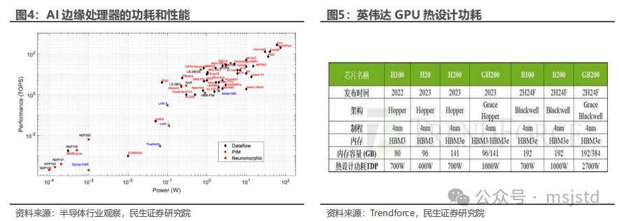算力快速提升导致芯片热设计功耗持续攀升,散热需求迫在眉睫。算力性能提升主要通过半导体工艺增加晶体管密度实现,这就导致在芯片制程遵循摩尔定律持续微缩的同时,芯片的集成度在持续提升。高性能计算在执行复杂的计算任务时需要极高的功率,这导致其单位面积内的功率密度显著提升,更高的功率密度意味着更多的热量集中在更小的区域内,这就使得芯片的TDP(热设计功耗)在持续提升。以英伟达Blackwell架构GPU为例,B200功耗高达1000W,GB200功耗更是高达2700W。按照传统的散热经验(风冷),芯片的散热密度存在物理极限,每平方毫米芯片的散热能力约为1瓦,英伟达推出的GPU功耗已经突破了风冷的散热极限,需要更高效的散热方案支持。