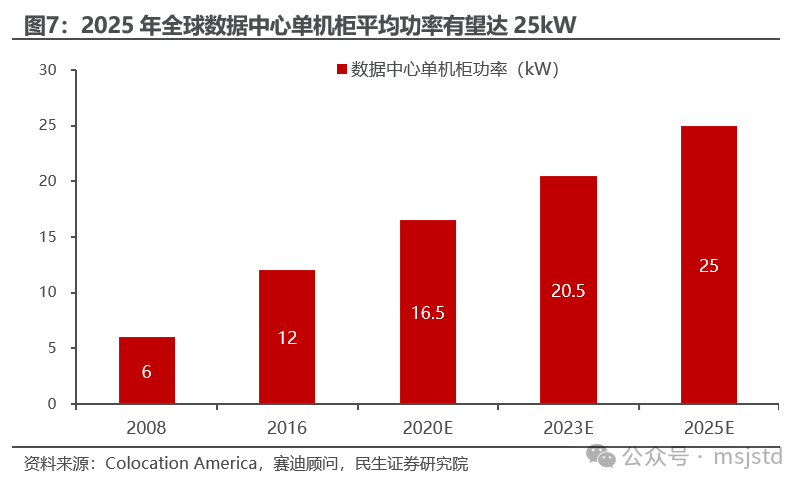 全球数据中心单机柜平均功率有望快速提升。作为解决计算力的核心支撑,AI服务器既可以用来支持本地应用程序和网页,也可以为云和本地服务器提供复杂的AI模型和服务,因而算力作为刚需将直接带动服务器的性能快速提升。据CDCC调研统计,2021年全行业8kW以上机组占比约为11%,2022 年 8kw 以上机组占比达到约25%; 据Colocation America数据,2020年全球数据中心单机柜平均密度达 16.5kW,赛迪顾问预计至2025年该数值有望达到 25kW。