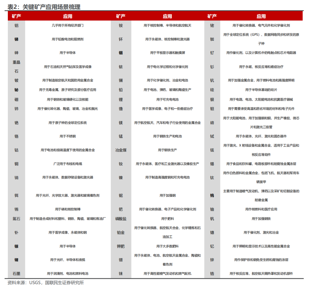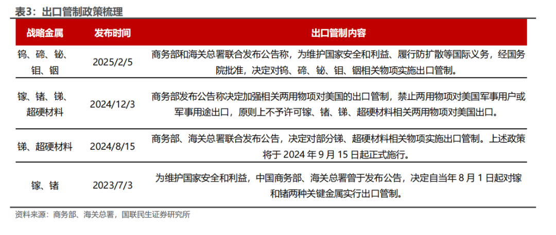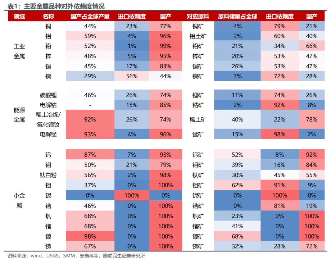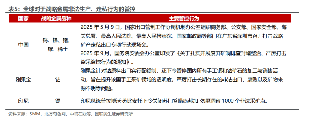战略金属的战略属性可以从两个角度来理解:一方面是基于供给的掌控力,优势的资源禀赋是大国博弈的重要筹码;另一方面是基于关键领域的应用需求,科技、军事等重点领域对于战略金属材料有硬性需求。从供给的掌控力来看,国内在工业金属和能源金属的矿端进口依赖度较高,在部分战略小金属矿端占据一定优势。矿端,国内在钨、钼、稀土、锑、锗、镓、钒等金属供应占据优势地位,进口依赖度均低于30%,在铜、铝、锌、锡、镍、锂、钴、锰、钽、铌、锆等金属供应进口依赖度均高于50%。冶炼端,国内在镍、铌的进口依赖度高于50%,其他金属冶炼品的进口依赖度均低于30%。 从关键领域的应用需求来看,钨、锑、锗、镓等国内占据供给优势的小金属也都在科技、军事等关键领域有重要应用。战略金属成为博弈的重要筹码,国家主动针对关键战略金属实施出口管制政策,国内外价格分化显著,战略属性定价不容忽视。2023年以来,国家相继针对镓、锗、锑、钨、钼、铋、铟等战略金属实施出口管制政策,由于中国在上述战略金属供应占据主导地位,出口管制对于海外市场供需平衡冲击较大,相关战略金属国内外价格走势分化明显。海外金属价格快速上涨抬升国内金属价格预期,国内金属价格向海外价格收敛。战略金属属性因此得到充分定价,国内战略金属价格整体呈现上涨趋势。 全球对于战略金属的重视同样也通过打击非法开采、非法走私等行为渗透到战略金属的供给管控之中。2025年5月9日,国家出口管制工作协调机制办公室组织商务部、公安部、国家安全部、海关总署、最高人民法院、最高人民检察院、国家邮政局等部门在广东省深圳市召开打击战略矿产走私出口专项行动现场会,严厉打击镓、锗、锑、钨、中重稀土等战略矿产走私问题。2025年9月,国务院安委会办公室又印发了《关于扎实开展废弃矿洞排查封堵整治、严厉打击盗采盗挖行为的通知》,组织公安部、自然资源部、生态环境部、应急管理部、国家市场监督管理总局、国家能源局、国家矿山安全监察局等部门,在全国范围内开展打击整治工作。针对战略金属非法开采、非法走私等行为的严厉管控,不仅彰显了国家对于关键战略金属管控的决心,严厉的惩罚措施以儆效尤也严格限制了非法开采的供应量。 全球锡资源储量分布较为集中,锡资源减量趋势明确。全球锡矿床主要集中分布环太平洋东西两岸,最重要的矿化区是东南亚区和东亚。全球锡矿资源的赋存特点为小型矿床多且分散,与具有商业价值的铜、铅、锌、镍和铝土矿相比,锡矿规模一般较小,品位较低,并且由于全球锡矿资源资本开支不足、新发现锡矿资源有限叠加需求稳步上升,全球锡矿储量呈现逐年下降的趋势。据USGS数据显示,2024年全球已探明锡矿储量为420万吨,较2001年下降270万吨;从结构上看,中国锡矿储量全球第一,2024年占比达24%。 全球锡矿近20年产量平稳,储采比持续下行,生产高度集中于中国、印尼、缅甸、秘鲁。近20年全球锡矿产量基本平稳,平均年产量约29万吨;据锡业股份公告数据,2024年全球锡矿产量27.84万吨,同比2023年减少3.25万吨,主要系缅甸佤邦锡矿停产导致;锡矿储采比持续下行,截至2024年锡矿储采比仅15年;全球锡矿生产区域分布较为集中,参考2024年USGS数据,中国占比最高,达到23.35%,其次主要是印度尼西亚、缅甸、秘鲁,分别占比16.92%、11.51%、10.49%。 缅甸是我国主要的锡矿进口国,缅甸复产进度缓慢或加剧供给紧缺局势。2023年4月15日缅甸佤邦财政部出台政策,宣布自2023年8月1日起,将停止一切勘探、开采、加工等作业,该政策已严格执行;2024年2月,缅甸发布《关于锡精矿出口统一收取实物税的通知》,税率30%,暂停征收现金税,进一步控制锡矿供给。从2024年4月开始,缅甸锡矿供应量显著下滑,当月国内自缅甸进口锡矿金属量降到1000金属吨以内。2025年年初以来,虽然缅甸逐步开启复产筹备工作,但中途受到地震因素影响,同时最新的《曼相矿区办理开采、选厂、探矿许可证》文件内明确了矿硐和选厂的收费标准,较2023年12月发布的“佤经字2023-08”号文件中提及的费用大幅提高,导致开采成本提升,降低投资人投资意愿,复产进度缓慢。作为我国最大的锡精矿进口国,缅甸佤邦复产进度缓慢或将加剧国内锡精矿供应紧张局势。 缅甸是我国主要的锡矿进口国,2025年1-11月国内自缅甸进口锡矿同比减少62%。2022-2023年缅甸锡矿进口量均超18万实物吨(约合4万多吨金属量),占国内锡矿总供应比例约三成,是我国主要的锡矿来源。2024年缅甸停产影响开始影响进口锡矿量,我国锡矿砂及精矿自缅甸进口量仅7.64万吨(对应约1.99万吨金属量),同比减少58%。2025年1-11月,国内自缅甸进口锡矿砂及精矿约2.89万吨,同比-62%,主要系缅甸复产节奏缓慢,国内矿端供应紧缺局势进一步加剧。 供给扰动二:印尼严厉打击非法走私锡矿,RKAB审批改革或拖累供应节奏 印尼锡矿储量基本稳定,锡矿产量呈现震荡下行走势,主要系陆地锡矿资源逐步枯竭。2022年印尼锡矿储量为80万吨,锡矿产量为7.4万吨,储采比为10.8。印尼锡矿开采历经陆上锡矿资源品位下降、开采枯竭并逐步转向滨海锡矿资源的过程。2024年,叠加出口许可证发放延迟影响,印尼锡矿产量仅5万吨,同比下滑。由于海底采矿难度较大,成本高,容易受季节性的影响,因此印尼未来锡矿供给不确定性