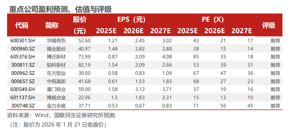 ◾ 钨:高端制造的“脊梁”,供给收紧刺激钨价显著上行。我国对钨矿开采实行总量控制,2025年第一批钨矿配额同比收紧;钨下游需求整体偏刚需,光伏钨丝、军工、核聚变等新兴需求有望持续放量,供需偏紧格局支撑钨价长期向好。