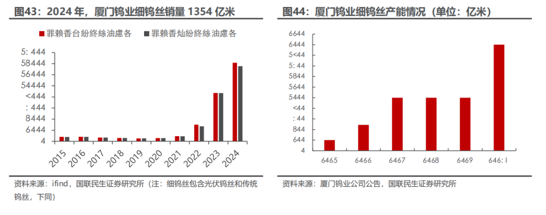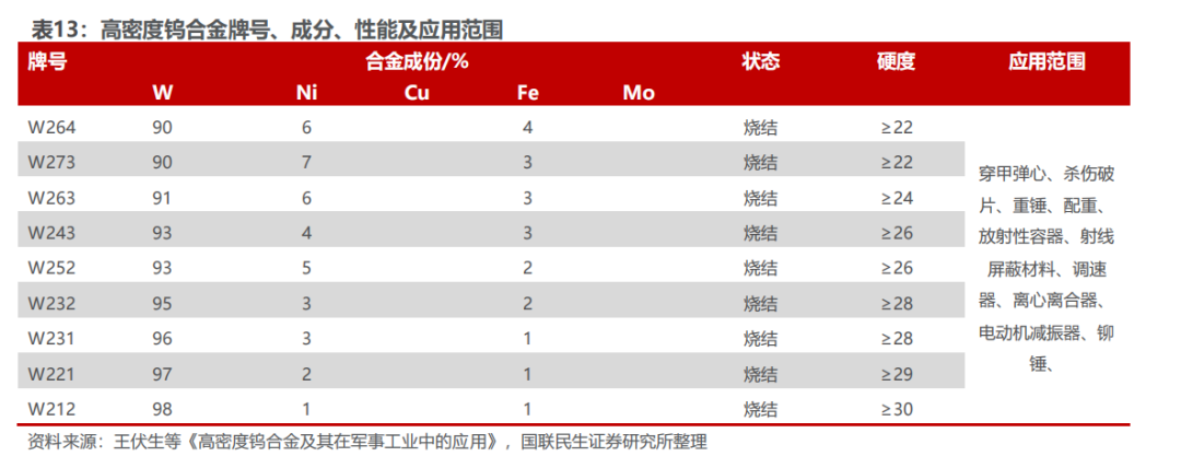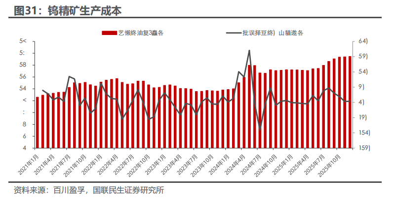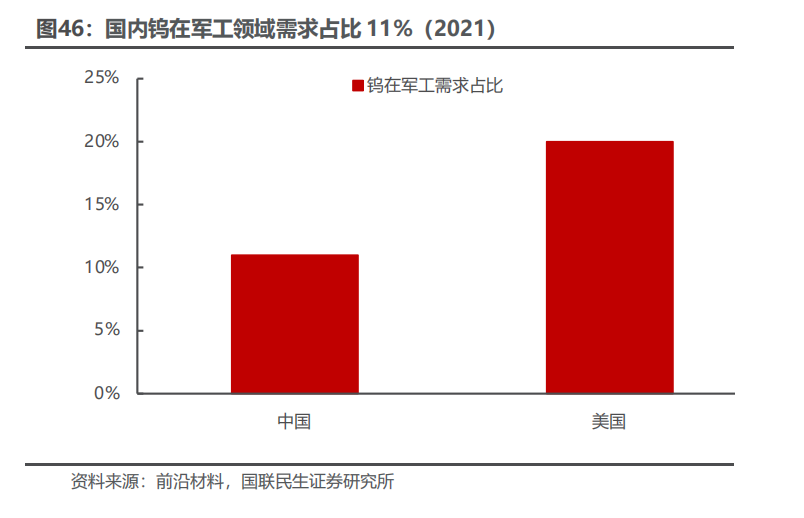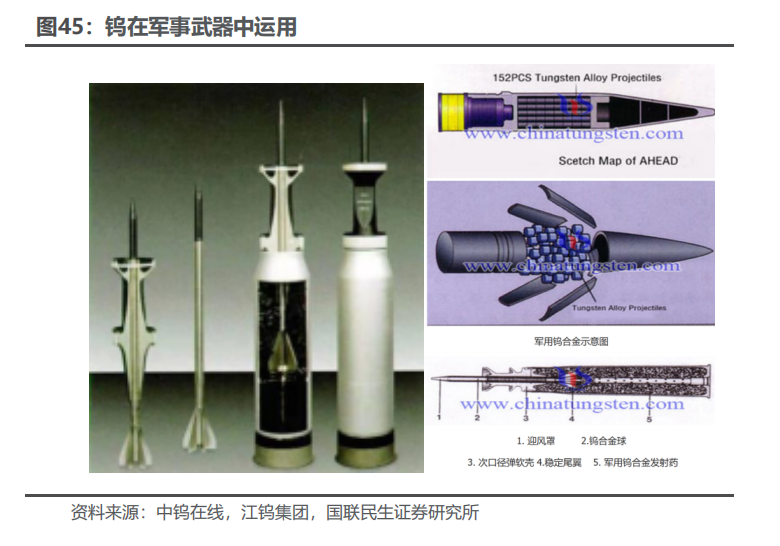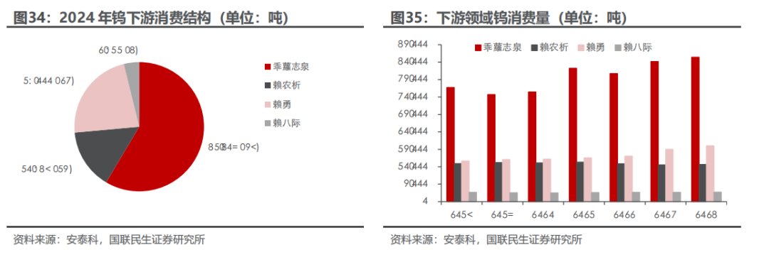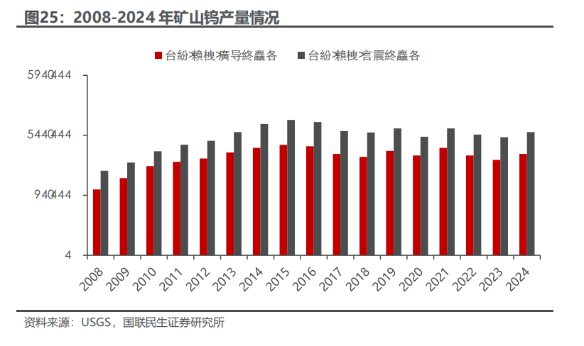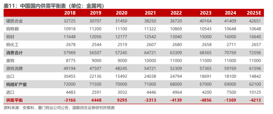 钨是一种有银白色光泽的金属,常温下不受空气侵蚀,化学性质比较稳定。钨金属因为其硬度大,熔沸点高,能耐高温,耐侵蚀等特点,通常被加工成硬质合金工具,钨特钢等,下游应用于交通运输、采掘、工业制造、军工等领域,是加工国之重器的关键工具,素有“工业牙齿”之称,更是“高端制造业的脊梁”。钨资源在地壳中的含量较少(只占地壳重的0.001%左右),因为钨资源的稀缺性和不可替代性,我国将钨视为战略性资源,它的开采受到国家的严格管控。1.2.1 供应端:钨供给维持刚性,产业链前端国内优势显著 我国的钨资源丰富,钨储量及矿山钨产量世界第一,2024年占比分别为52.5%和82.3%。2024年全球钨资源储量约576万吨,中国钨资源储量为303万吨,占比最大为52.5%;全球矿山钨产量约10.3万吨,中国矿山钨产量为8.4万吨,占比最大为82.3%,且1994年以来,我国一直贡献世界最大的钨矿产量。 国家对钨矿开采实行总量控制,2025年钨矿配额整体呈现收紧趋势,第一批配额同比减少6.5%。钨矿开采总量指标由2016年的9.13万吨增长至2024年的11.4万吨,CAGR为2.81%。我国钨矿主要分布在江西,湖南,广东,广西等地,2024年江西省钨精矿开采总量控制指标为4.03万吨,占全国总量的35.4%,居第一位,其次为湖南省(3.0万吨,26.3%),河南省(1.41万吨,12.4%)。自然资源部下达2025年钨矿第一批开采指标为58000吨,同比下滑4000吨,连续两年下滑(23年第一批63000吨,24年第一批62000吨)。从指标占比分布来看,前五大主要产区没有变化,其中江西减量最多达2370吨,云南减量400吨,广东减量266吨,广西减量240吨,黑龙江、湖北、浙江、安徽等区域合计减量720吨,开采配额归零。2025年第二批配额不公开披露,彰显战略金属重要资源属性。 在开采指标的限制下,供应端的难有大的增量,钨精矿库存持续去化。USGS数据显示,2022年全年钨精矿产量6.6万吨,同比下滑7%;2023年,钨精矿的产量约为6.6万吨,同比持平;2024年,钨精矿产量约6.7万吨,同比增长1.5%。据百川盈孚数据,钨精矿库存自2025年年初以来持续去化,主要系开采配额减量叠加国家严厉打击非法开采行为,反映钨矿端供应偏紧格局。 钨矿开采难度高,成本端支撑较强。近年来钨精矿的开采品位越来越低,开采条件和技术难度越来越大,社会和国家对产业人员的生产、生活环境和质量要求的进一步提高,钨精矿成本维持高位。据百川盈孚数据,2023年钨精矿生产成本基本处于9.6-10.7万元/吨范围, 2024年,钨精矿生产成本显著抬升,突破13万元/吨范围,2025年钨精矿成本稳步上行突破15万,钨价成本支撑较强。 海外钨矿新增供给有限。海外钨矿项目主要分布在哈萨克斯坦、韩国、加拿大、欧洲、澳大利亚、东南亚等地区,目前正在开发的钨矿项目主要包括哈萨克斯坦的巴库塔钨矿和韩国的Sangdong钨矿。哈萨克斯坦的巴库塔钨矿是全球第四大WO3矿产资源量钨矿(包括露天钨矿及地下钨矿),一期项目计划将于2025Q2开始商业化生产,2025年的目标年度采矿及矿物加工能力是330万吨钨矿石,2027Q1开启二期项目商业化生产,目标是加工495万吨钨矿石。韩国Sangdong钨矿目前也正在复产筹备之中,2026年有望开始生产。考虑项目爬坡需要一定周期,预计海外钨矿新增供给冲击较小,新增供给量级也较为有限。 中国作为全球最大的APT生产国,年产量占全球60%以上,掌握钨产业链的核心中间体。仲钨酸铵,简称APT,是钨冶炼和加工的关键中间体,是制备各种钨产品的重要原料,其纯度直接影响下游材料的性能。通过高温还原过程,仲钨酸铵可以转化为钨粉和碳化钨,进而用于制造硬质合金、钨丝、电子材料等产品。据百川盈孚统计,2024年国内仲钨酸铵产能合计约17.6万吨,主要分布在江西、湖南、河南和福建等地,四省份占比我国仲钨酸铵整体产能9成份额;2024年国内APT产量合计约10万吨,江西占比我国APT产量61%,湖南占比19%,河南和福建合计占比10%,主要因我国大型钨矿整体集中在江西和湖南等地。中国作为全球最大的APT生产国,年产量占全球约80%,海外基本都依赖于从中国进口仲钨酸铵等钨冶炼原料。从全球钨产业链的分工来看,国内在钨产业链前端占据优势地位,包括钨矿、钨冶炼产品等,而国外钨企业基本不涉及钨资源开发和冶炼环节,所使用的原料如仲钨酸铵、氧化钨、钨粉、碳化钨等主要从我国进口,然后进行精细加工。2025年2月5日,中国商务部与海关总署联合发布了对钨等相关物项实施出口管制的公告,仲钨酸铵(APT)作为25种稀有金属产品及其技术之一,被纳入出口管制范围,对海外钨深加工产业链或产生较大冲击。在国内进行出口管制的背景下,海外无论从资源端还是冶炼端都难以快速建立有效产能缓解钨产品短缺局面,钨战略属性凸显。1.2.2 需求端:从工业的“牙齿”到高端制造的“脊梁” 从钨的初级消费领域口径来看,2024年下游总消费量同比增长3.52%至7.08万吨,其中,硬质合金行业的钨消费量最大约为4.14万吨,同比增长3.10%,占比58.51%。钨下游消费领域还包括钨材、钨特钢以及钨化工,2024年钨材、钨特钢以及钨化工消费量或将分别为1.60万吨、1.06万吨、2711吨,同比变化 6.67%、 1.00%、 1.99%。 在硬质合金的下游消费结构中,占比最大(45%)的是切削工具合金,其次是耐磨工具合金(27%),矿用工具合金(25%)。 钨精矿的供应受指标控制难有大的增量,随着制造业复苏,对于精矿的需求将提升,钨精矿供应预计将偏紧。2024年钨供需缺口约